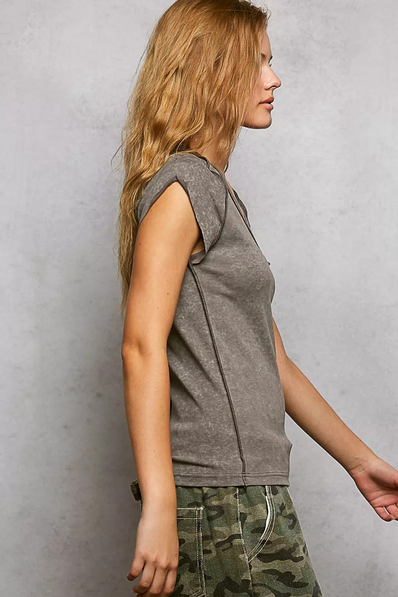POL V-Neck Short Sleeve Washed T-Shirt with Outseam