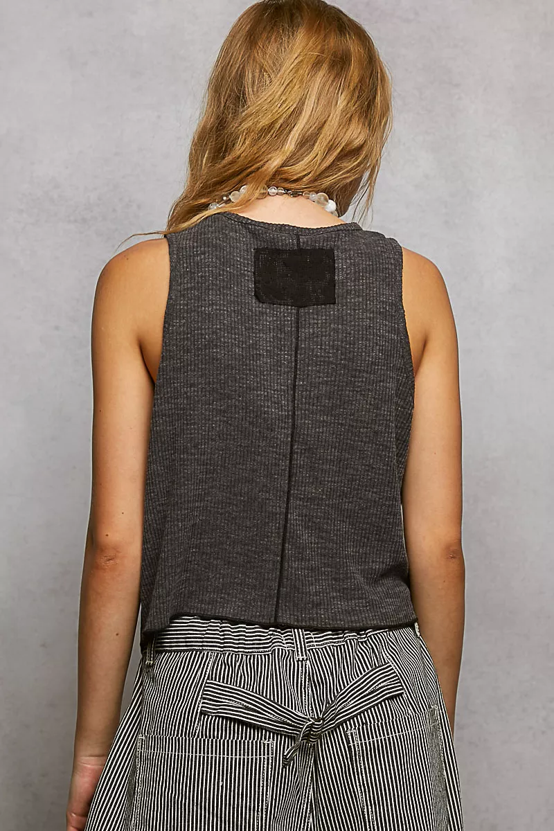 This top is designed with a round neck and sleeveless cropped fit. It features a ribbed texture with panel detail for added style. The pointed solid pattern adds a unique touch to the overall design. This top is perfect for a casual yet trendy look. Pair it with high-waisted pants or a skirt for a fashionable outfit.