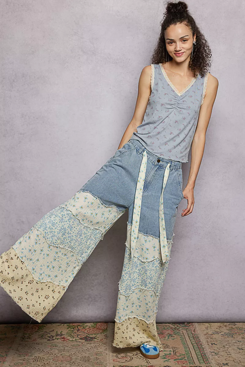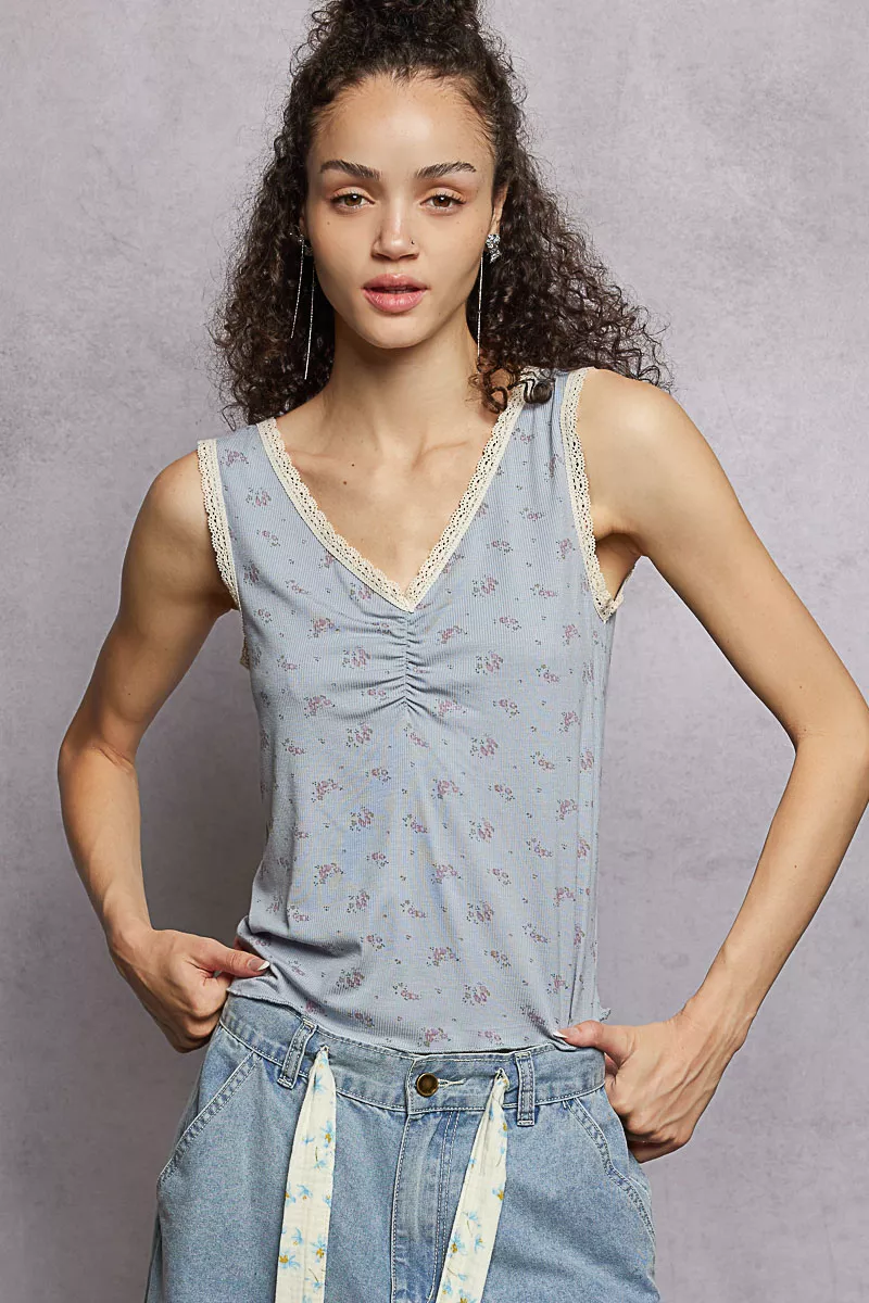 POL Ruched Floral V-Neck Tank with Lace Detail