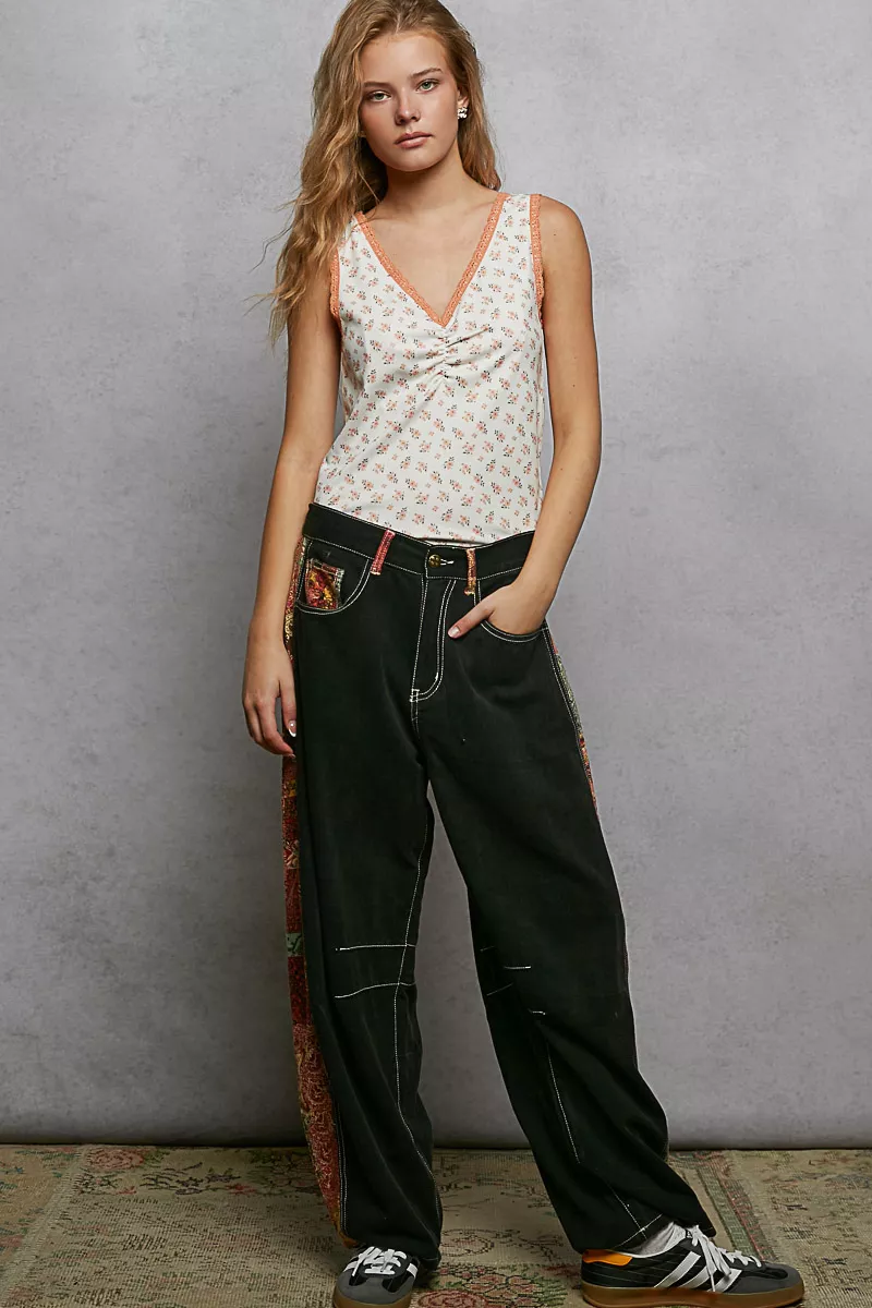 POL Ruched Floral V-Neck Tank with Lace Detail