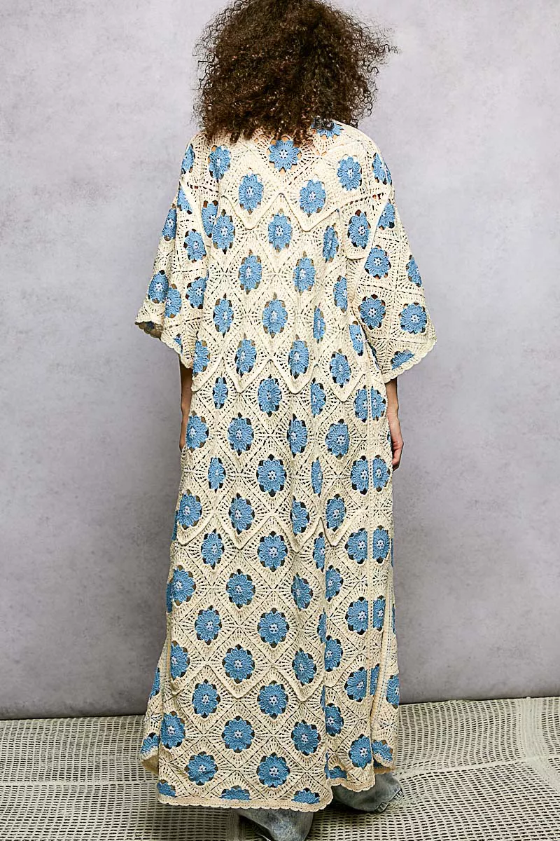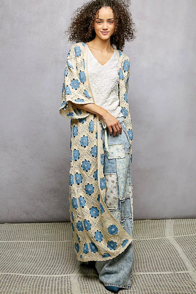 POL Open Front Floral Crochet Longline Cardigan