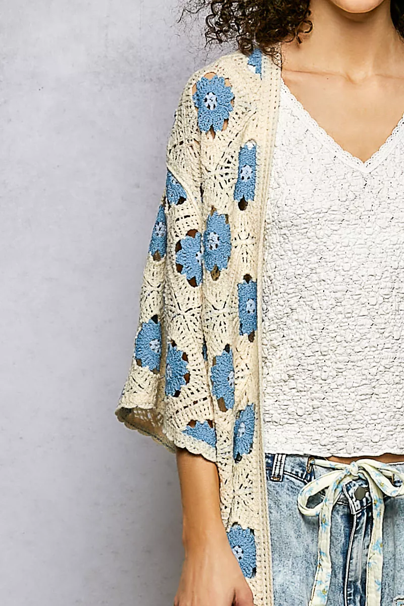 The 3/4 sleeve roomy fit cardigan in crochet is designed with a relaxed and comfortable silhouette, perfect for easy layering. The crochet construction features a floral pattern detail and border accents, adding a feminine and elegant touch to the piece. The 3/4 sleeves offer a stylish look while providing coverage and ease of movement. This cardigan is versatile and can be dressed up or down for various occasions. With its intricate crochet work and beautiful floral design, this cardigan is a lovely addition to your wardrobe for a chic and bohemian-inspired look.