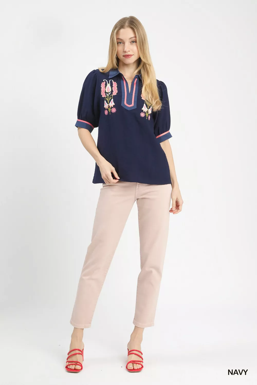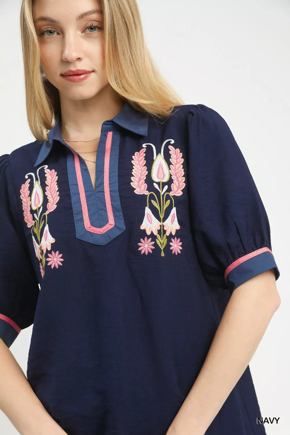 Umgee Embroidered Puff Sleeve Contrast Trim Top