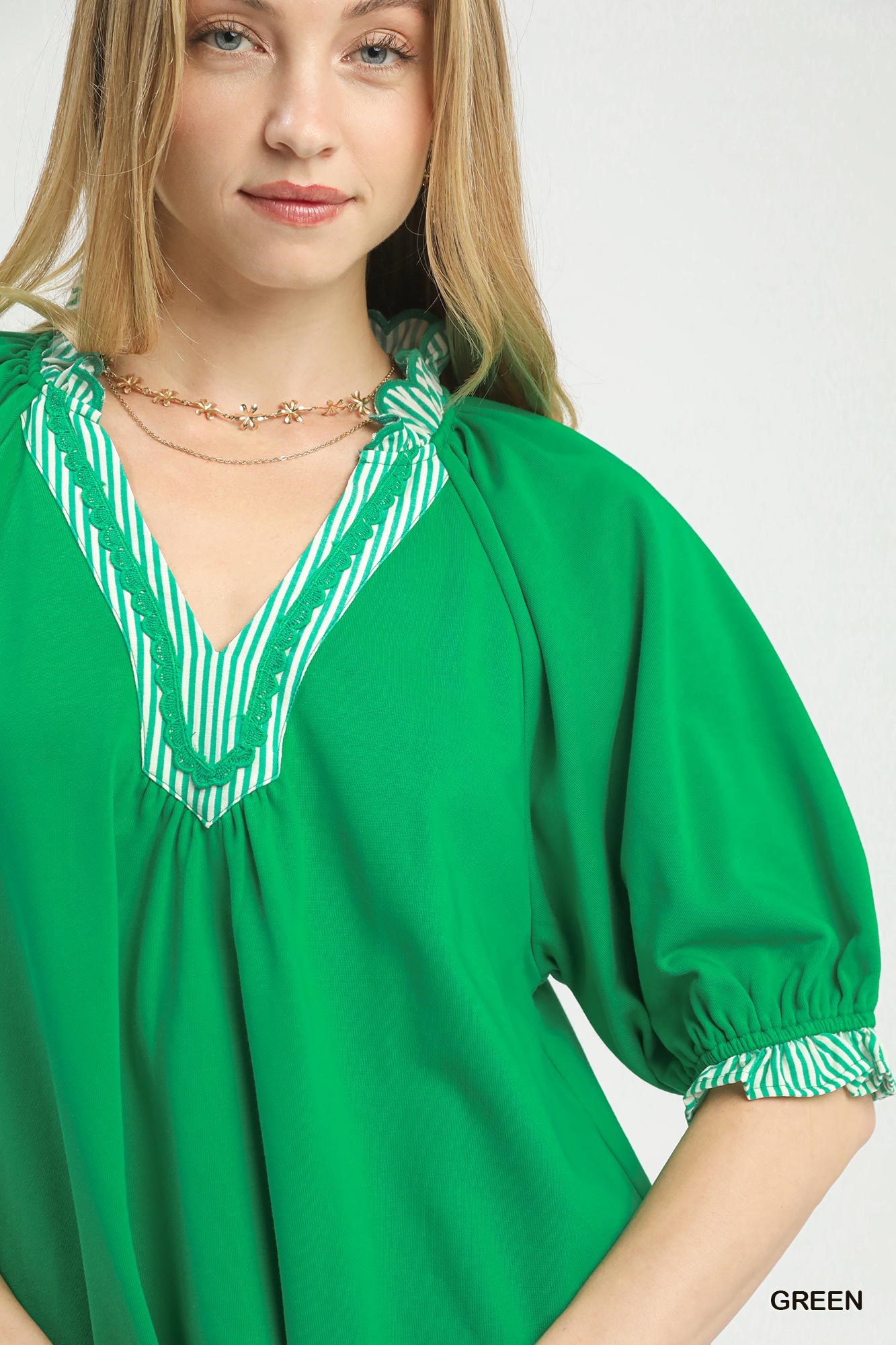 This collared top is made of French Terry fabric, ensuring a comfortable and cozy wear. It features a chic V-neckline that adds a touch of sophistication to the design. The short puff sleeves with elastic ruffle cuffs provide a stylish and feminine look. This top is not lined, making it suitable for casual outings or lounging in ultimate comfort.