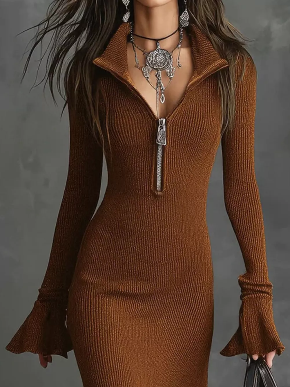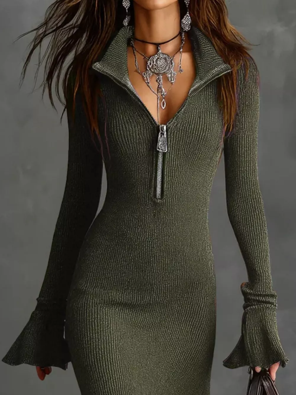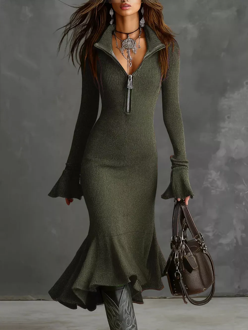 Ribbed Knit Zip Front Flare Hem Midi Dress
