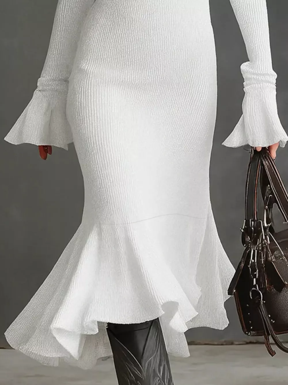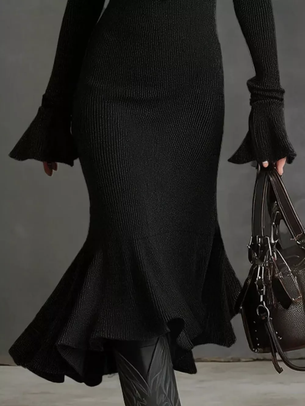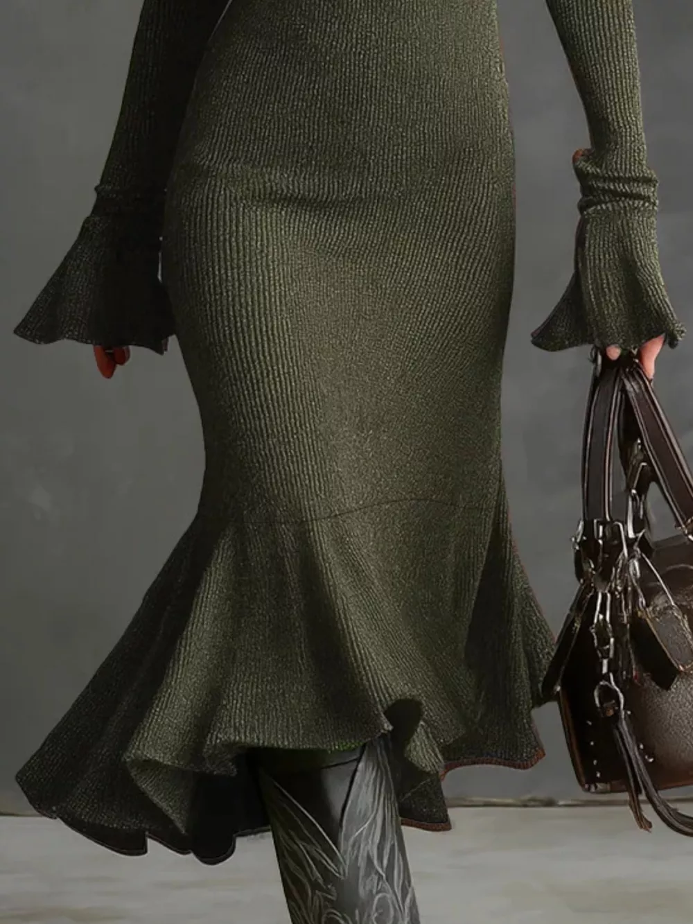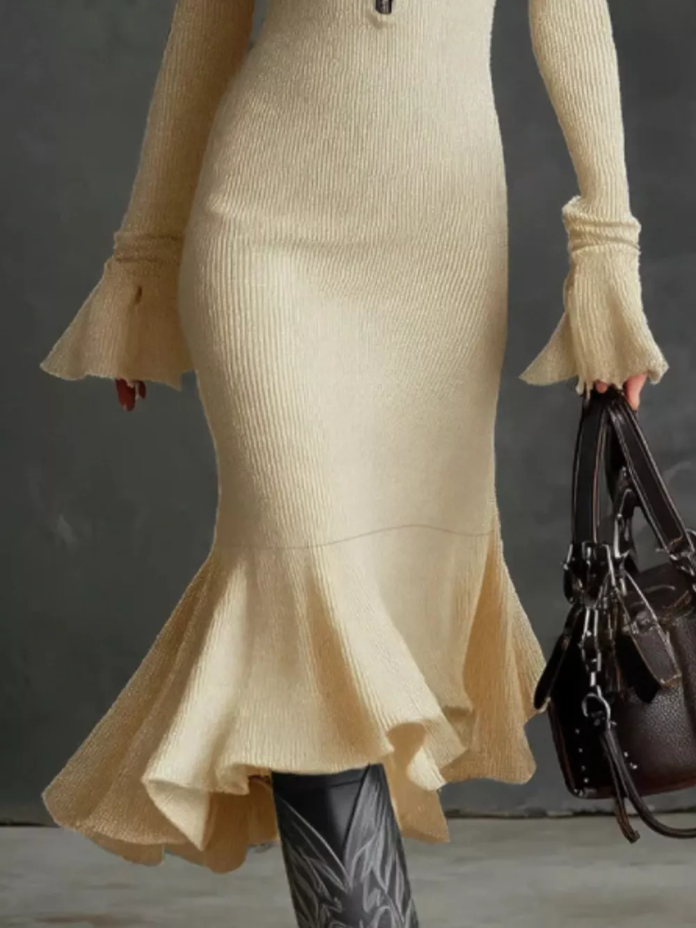 Ribbed Knit Zip Front Flare Hem Midi Dress