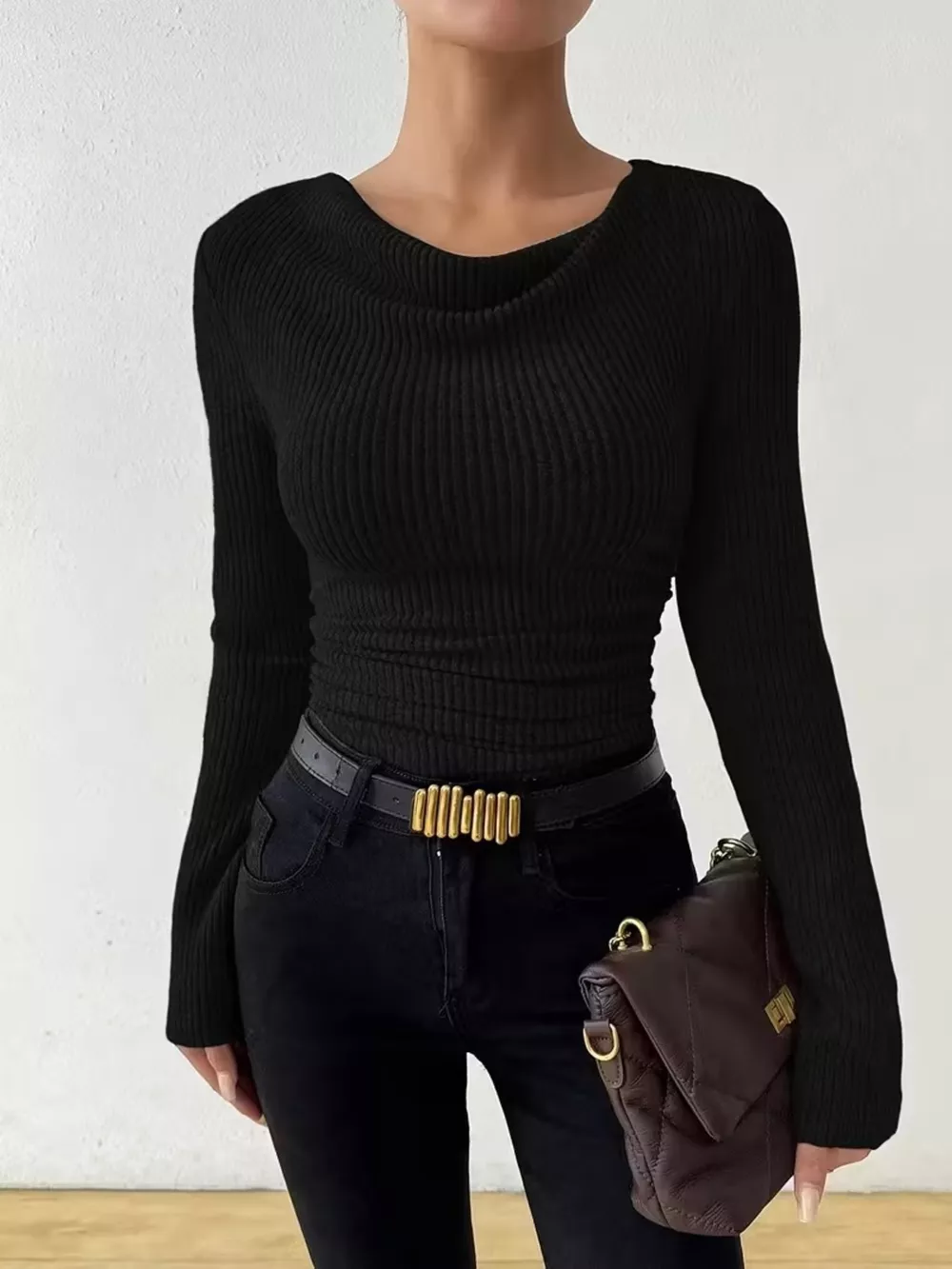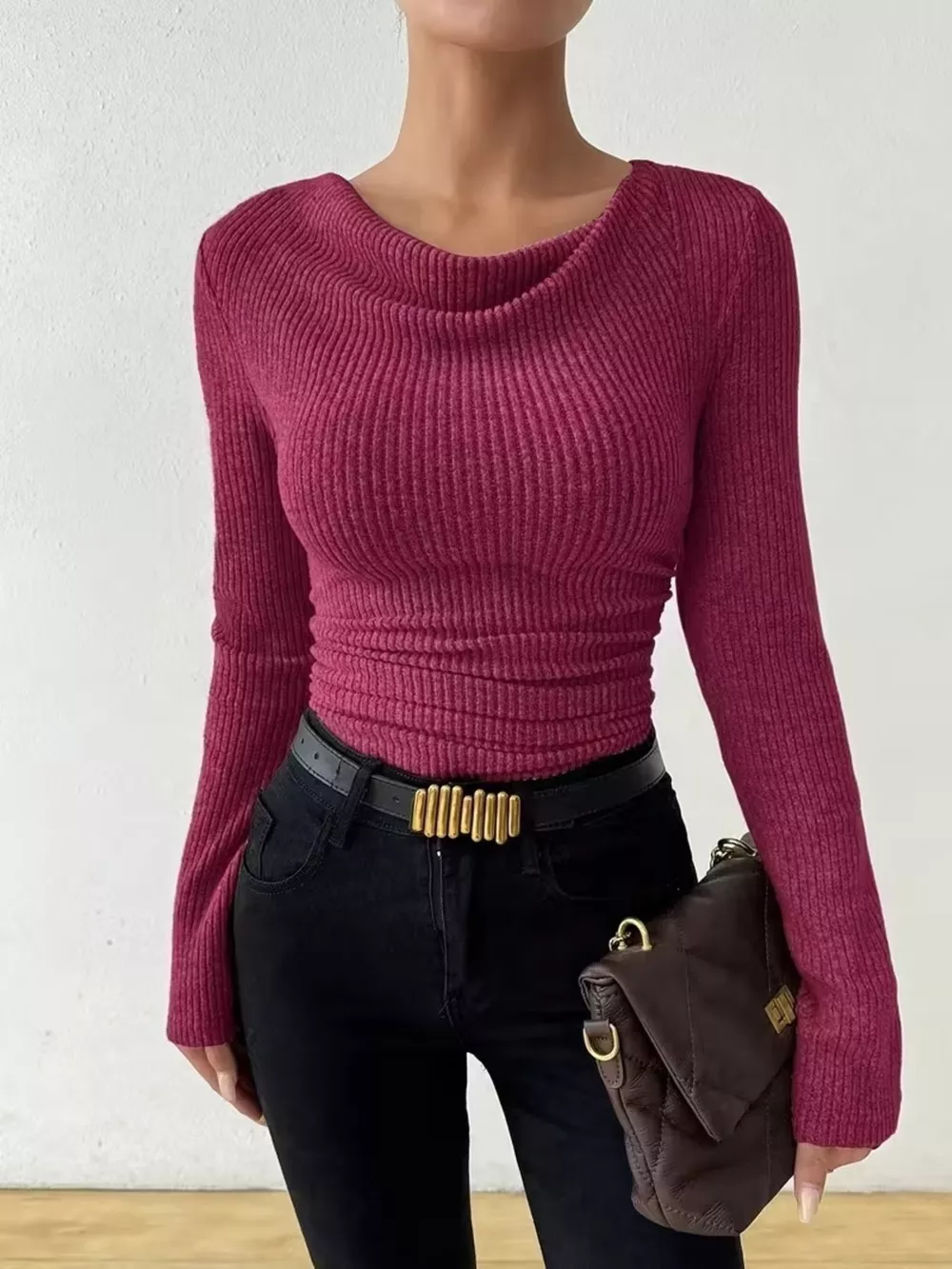 Cowl Neck Ribbed Long Sleeve Sweater