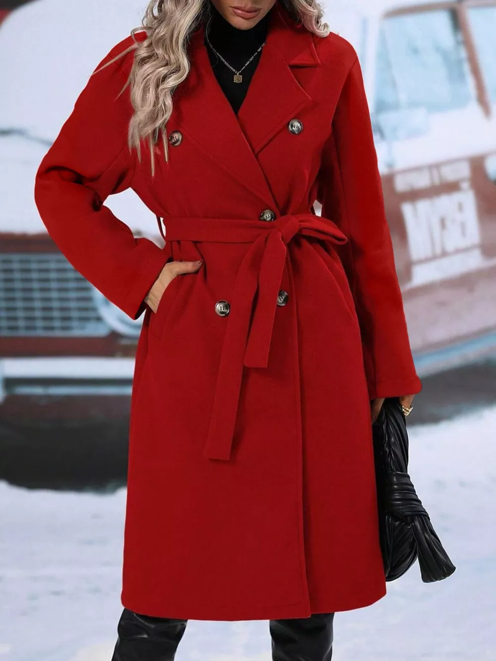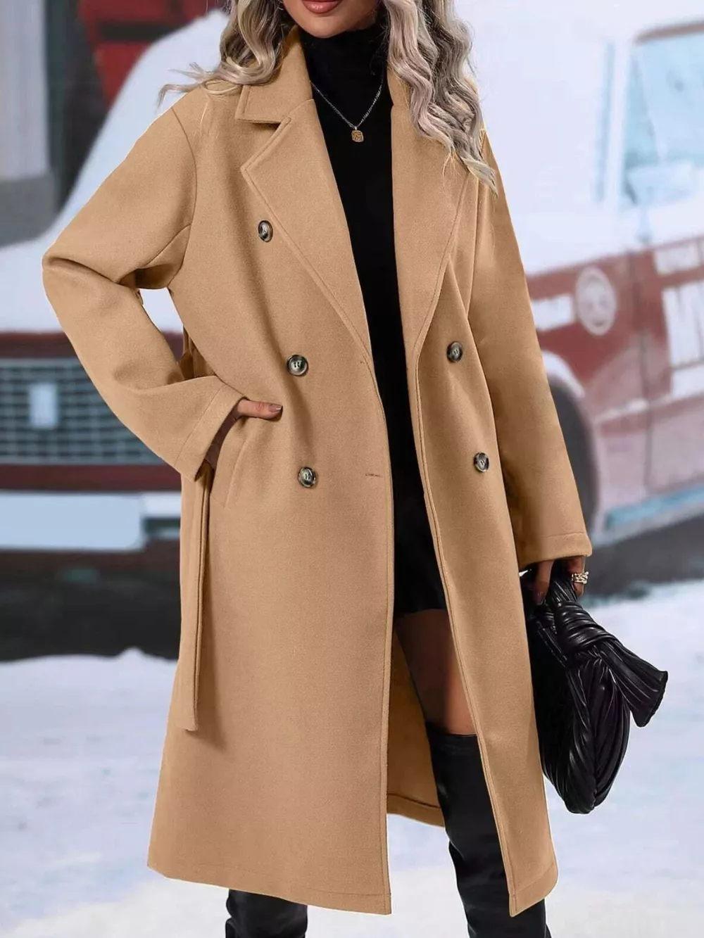 - Features:Buttoned,Belted,Double-breasted