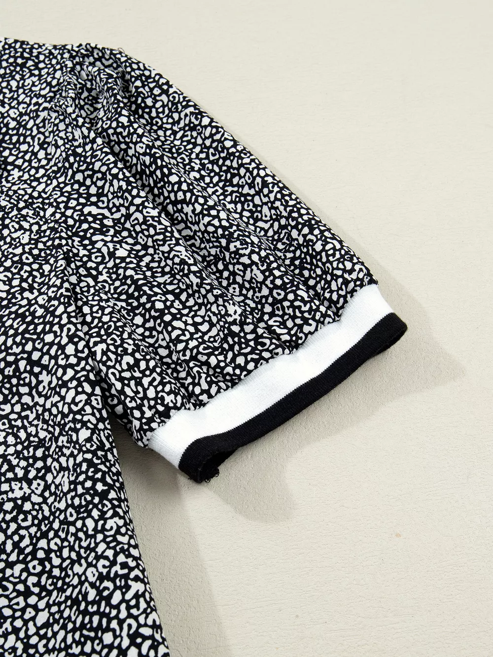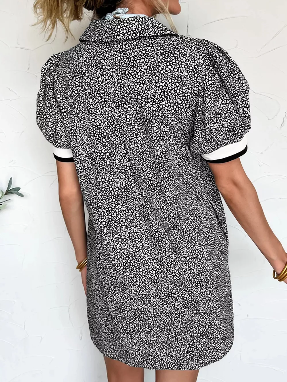 Leopard Print Contrast Striped Trim Polo Collar Short Sleeve Dress with Pockets
