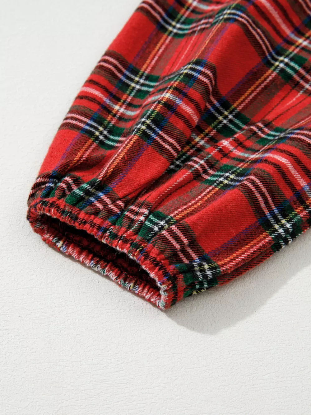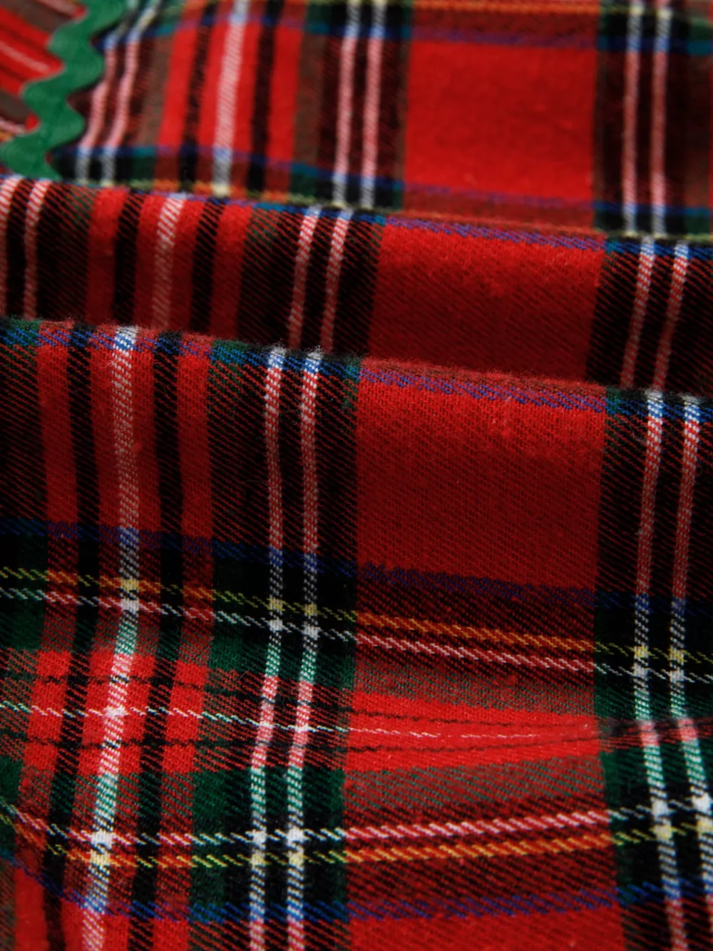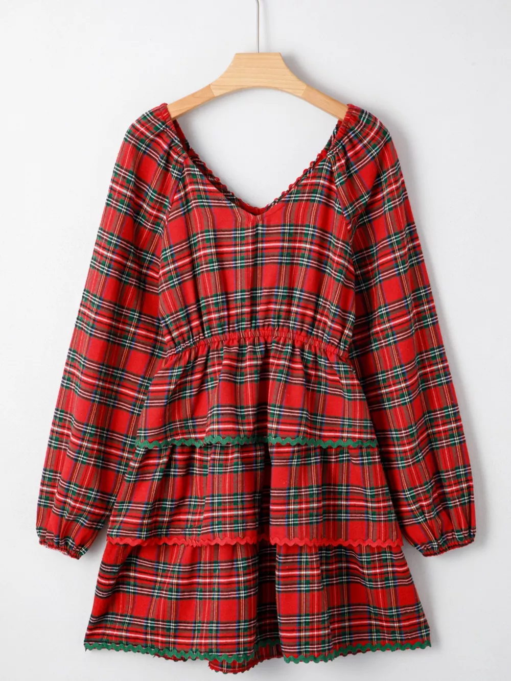 Plaid Print Ricrac Tiered Bubble Sleeve Mini Dress