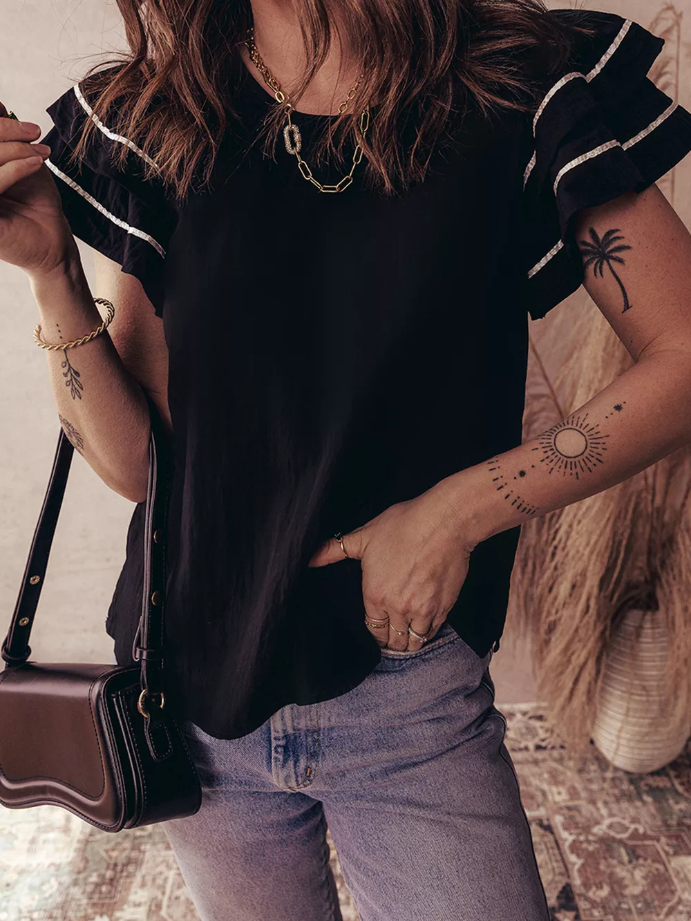 Contrast Trim Dual Ruffle Short Sleeve Textured Blouse