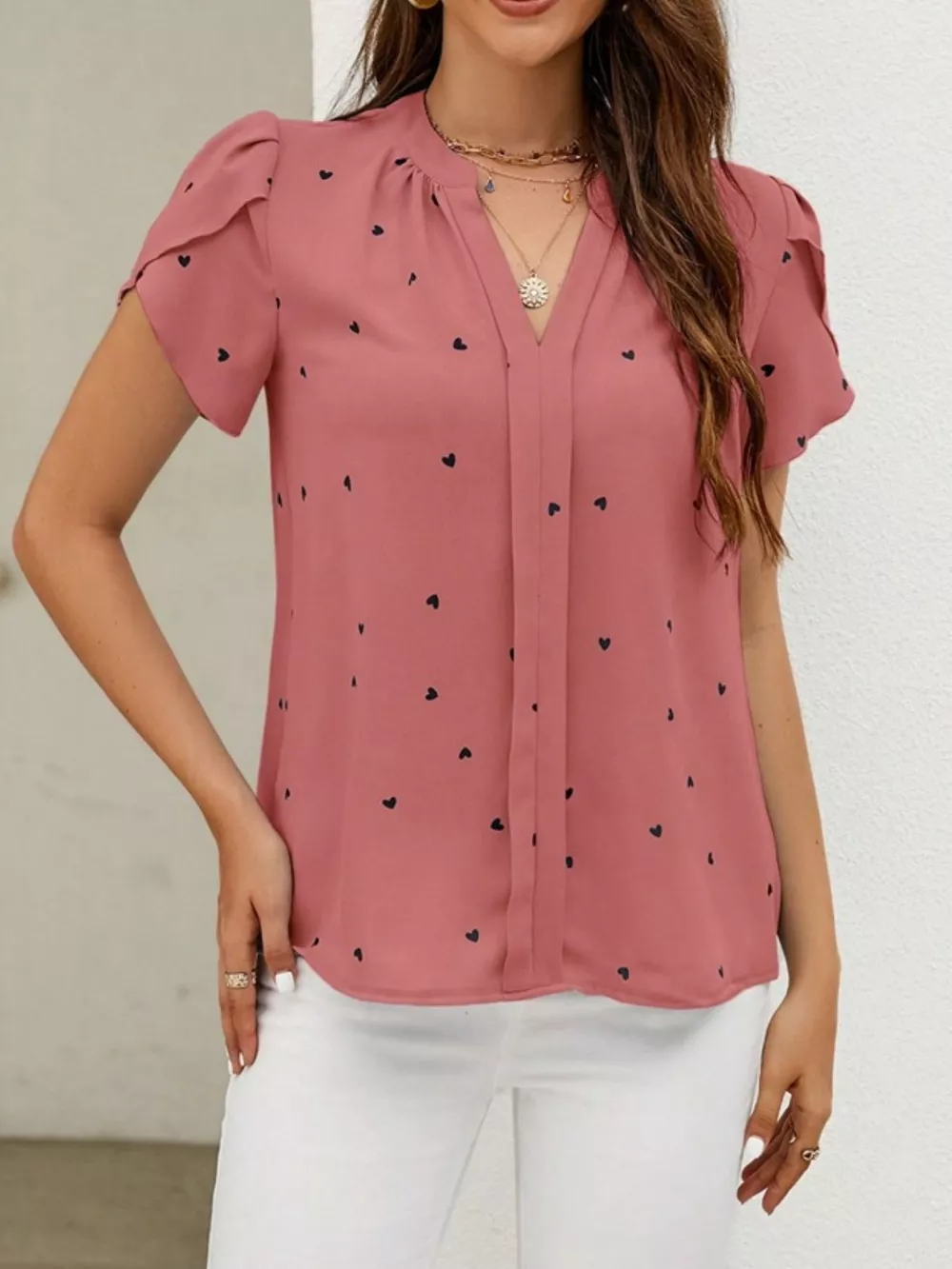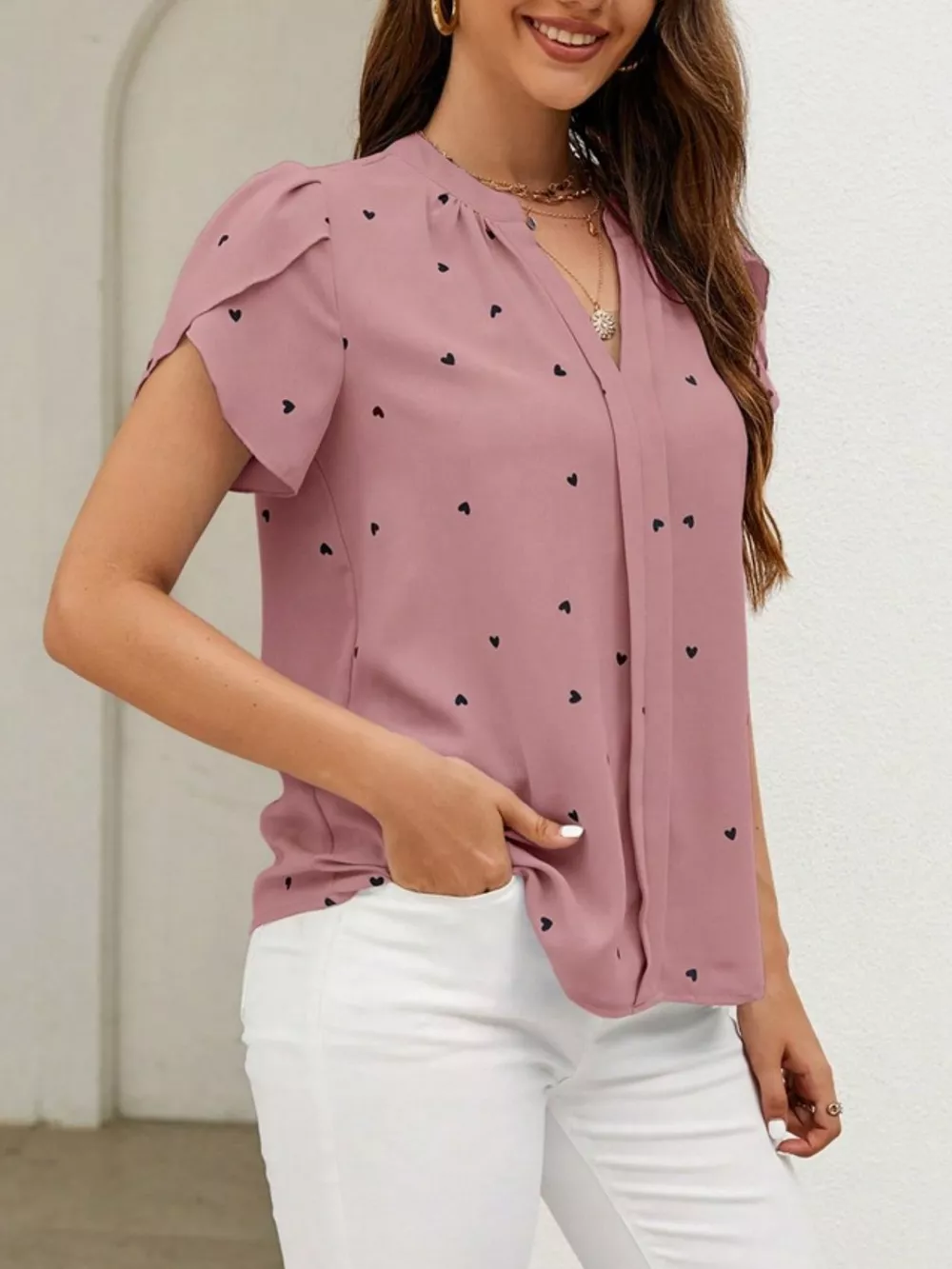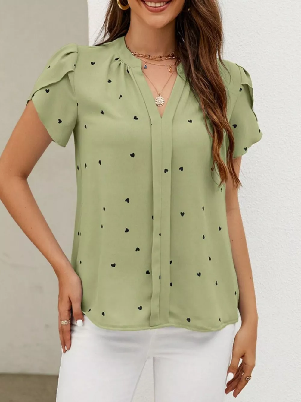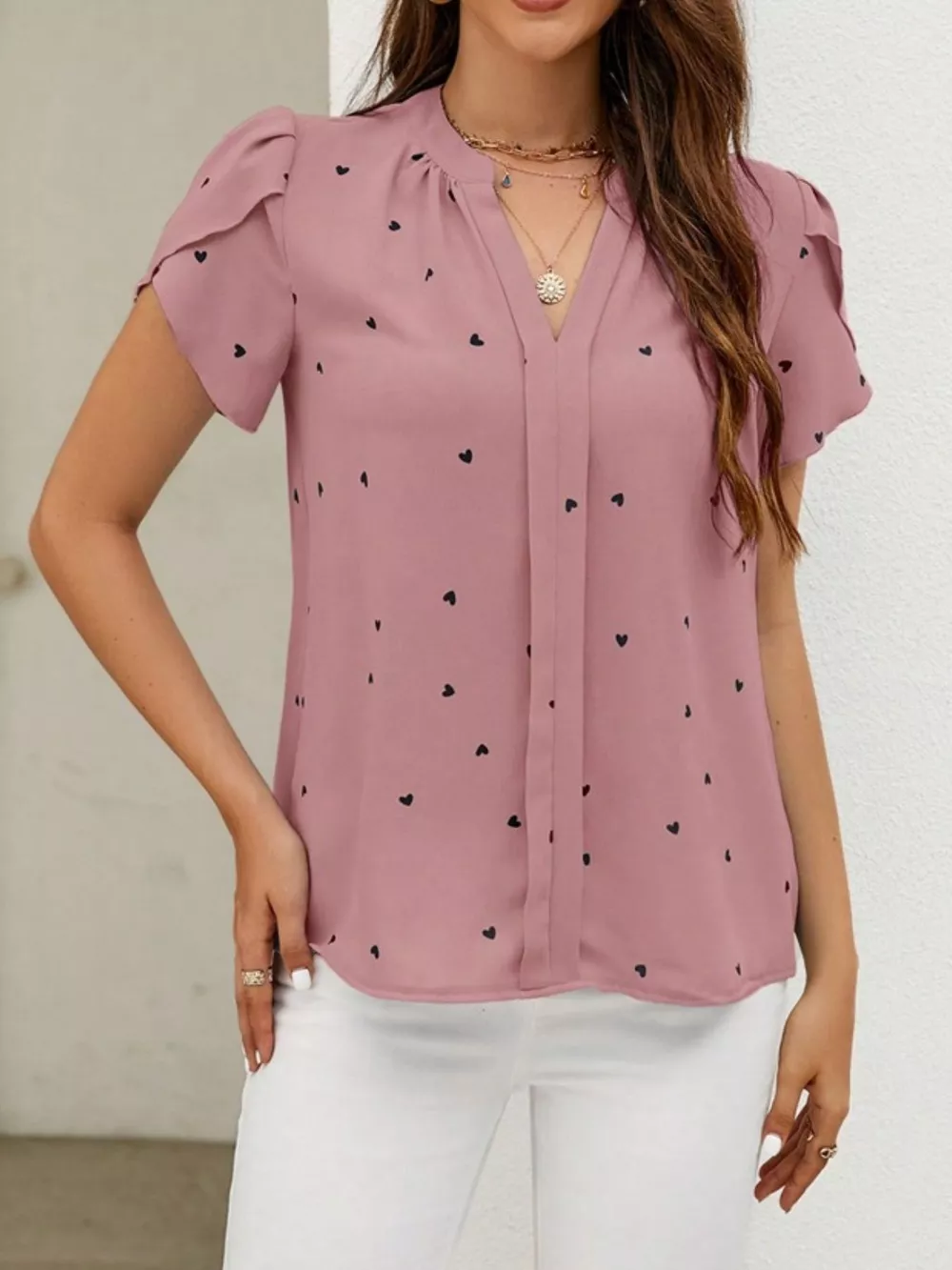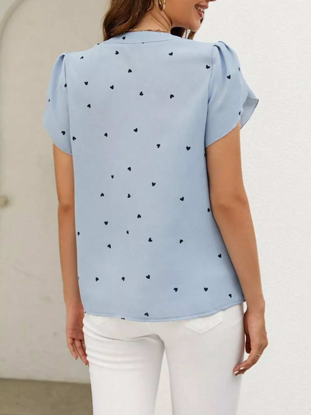 Heart Print Petal Sleeve Blouse