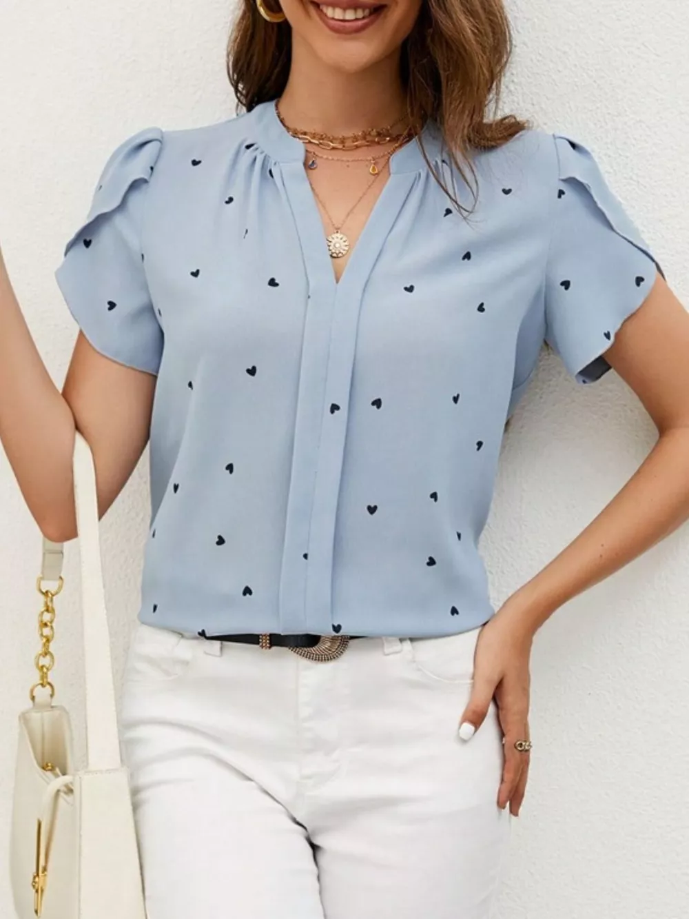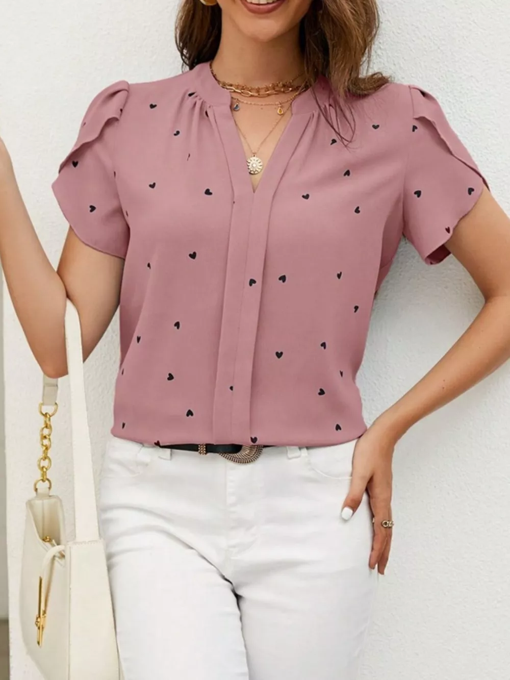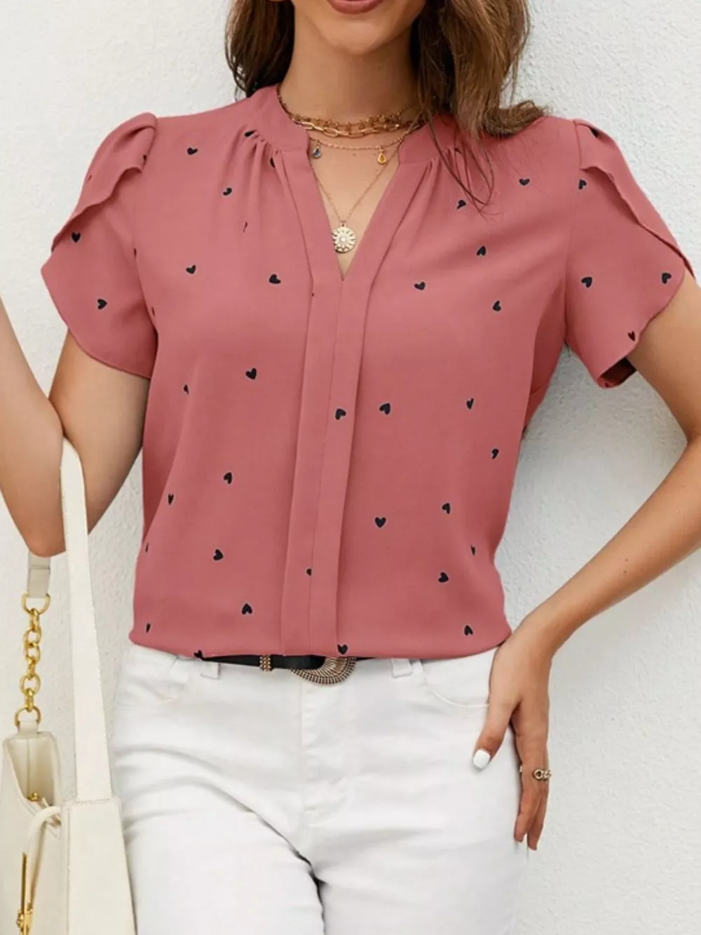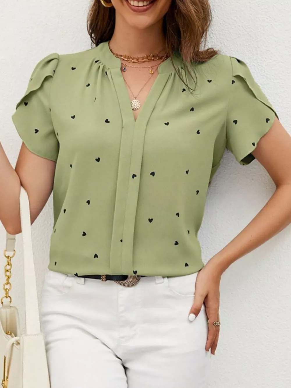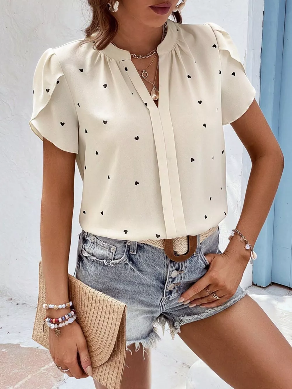 Heart Print Petal Sleeve Blouse