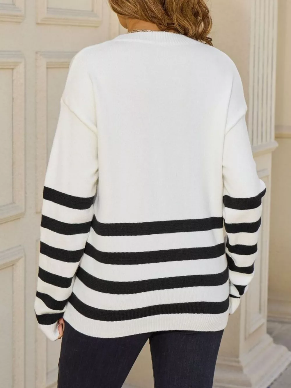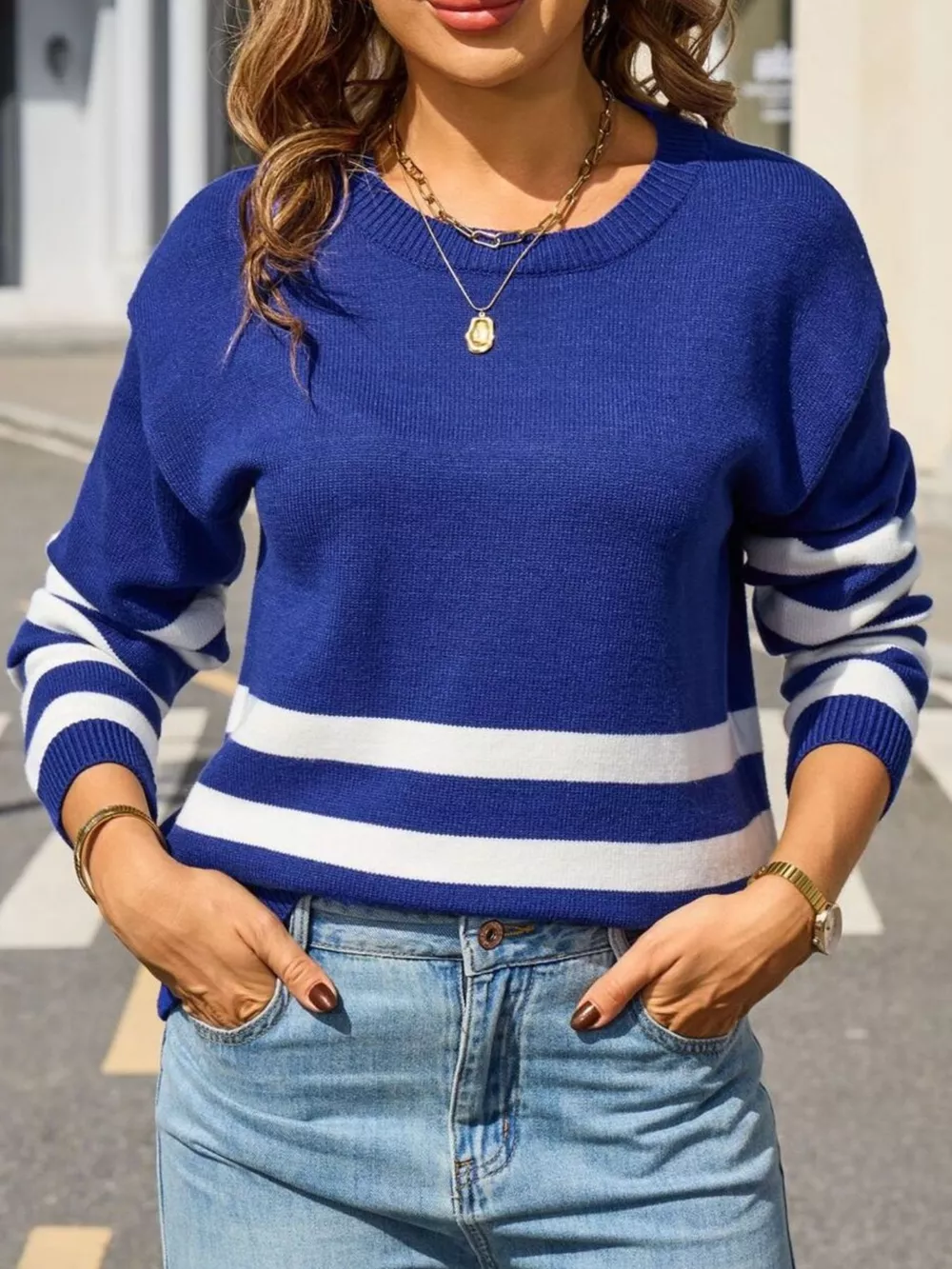 Striped Trim Crew Neck Sweater