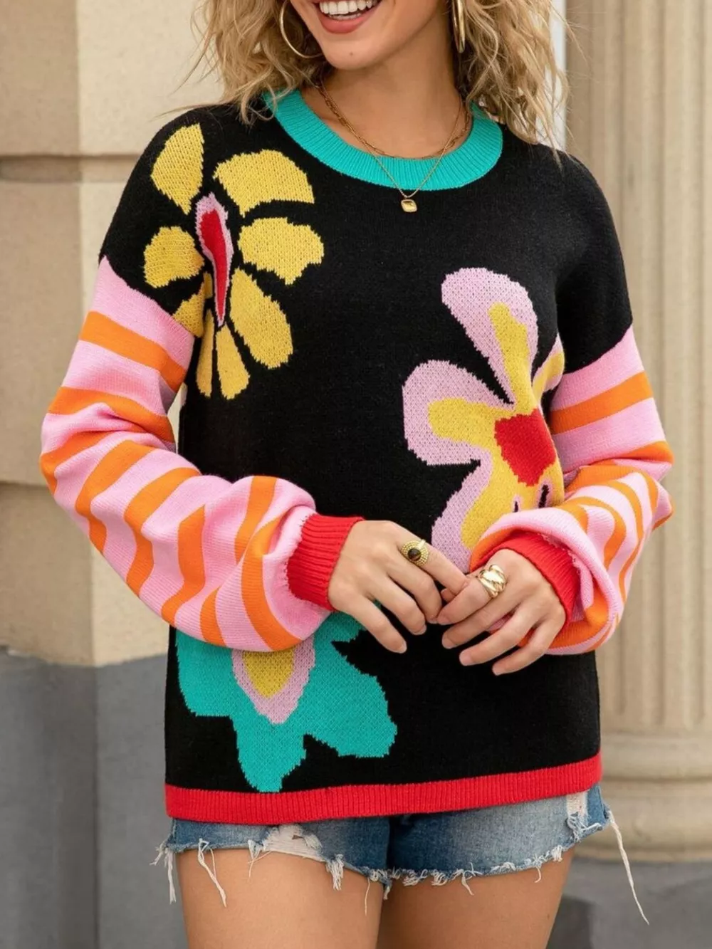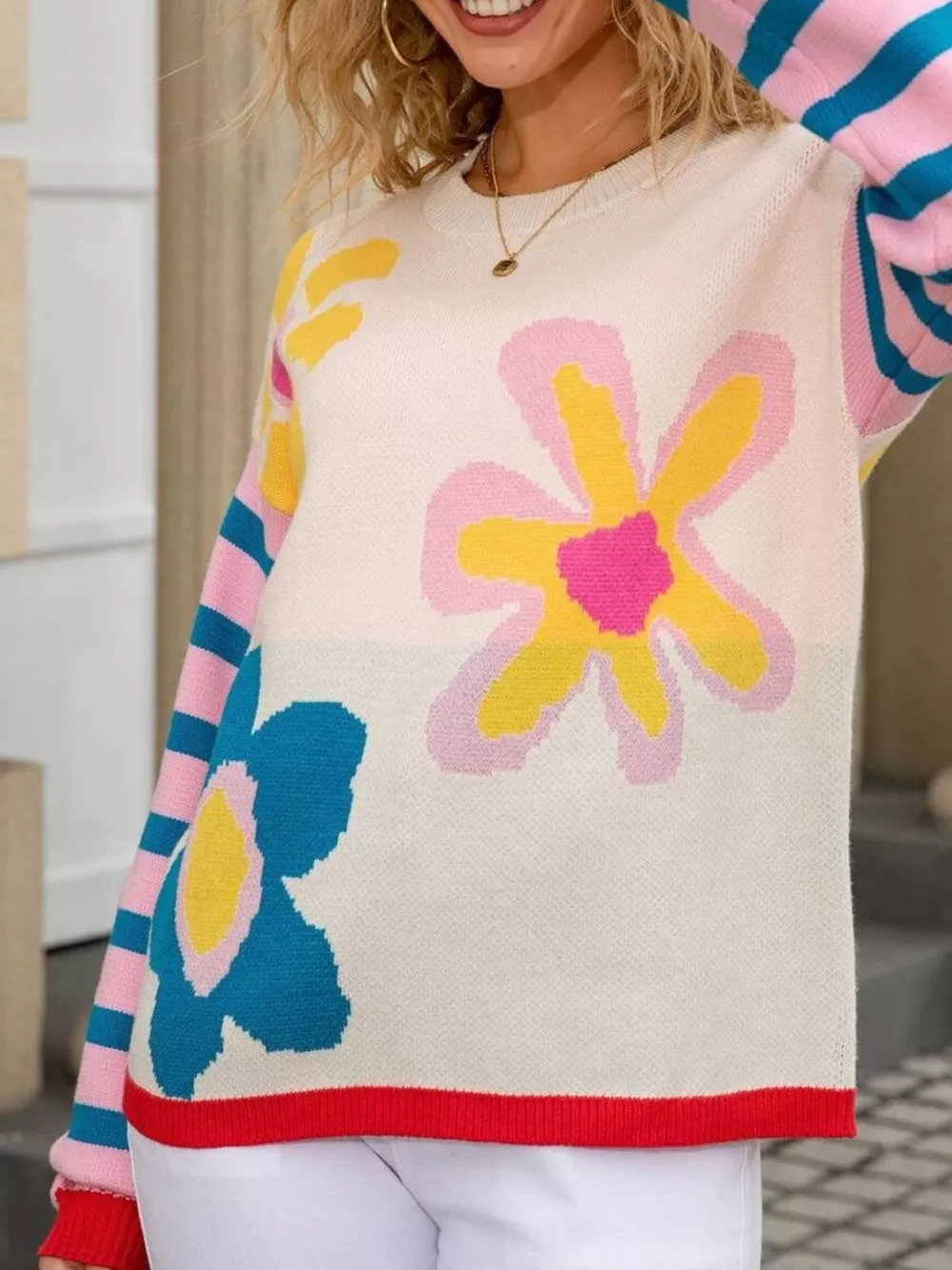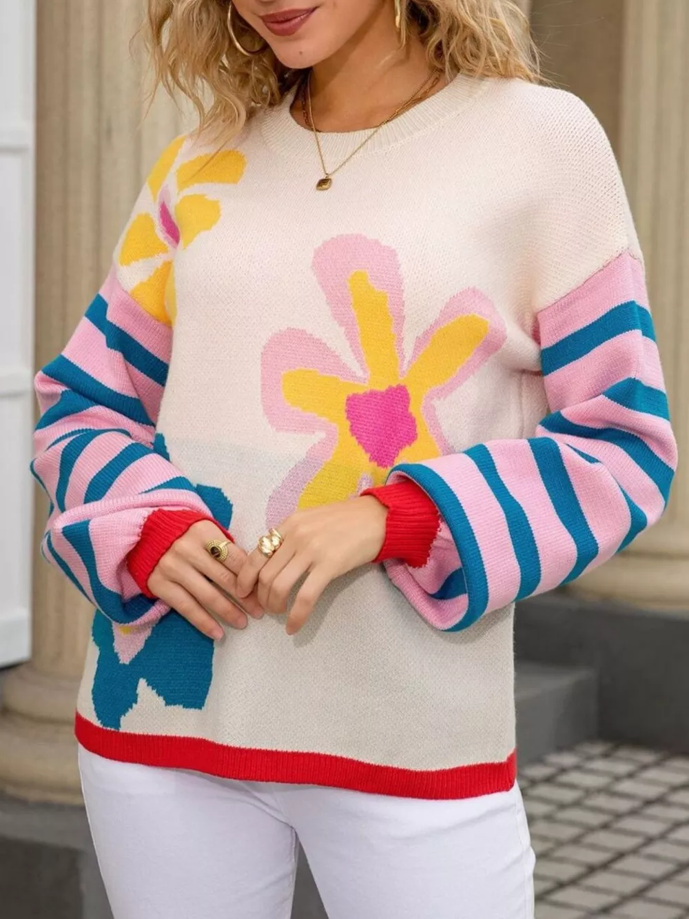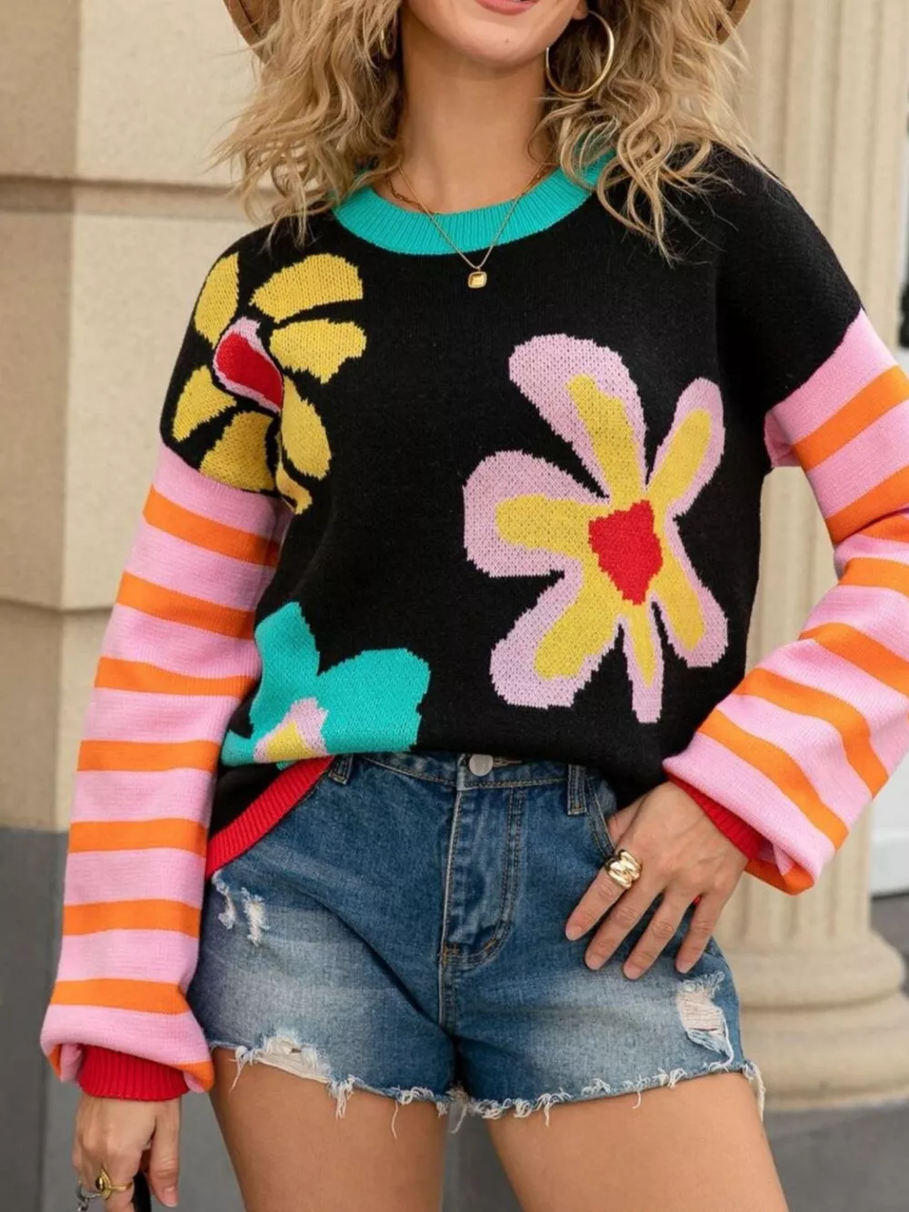Floral Striped Crew Neck Sweater