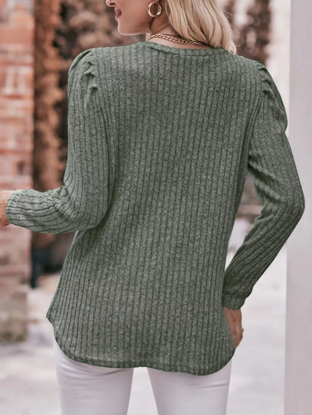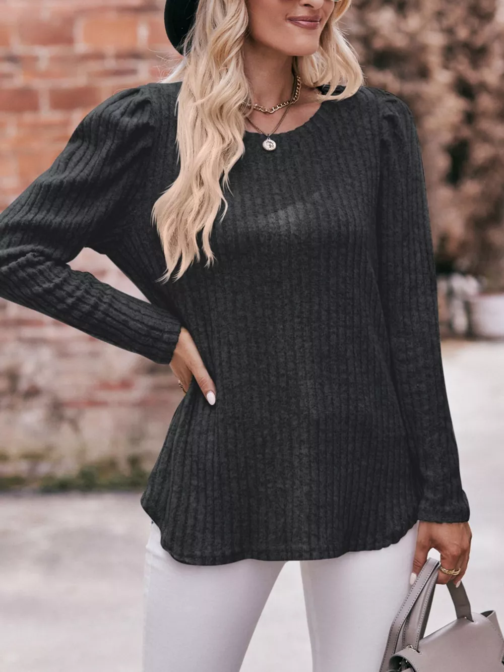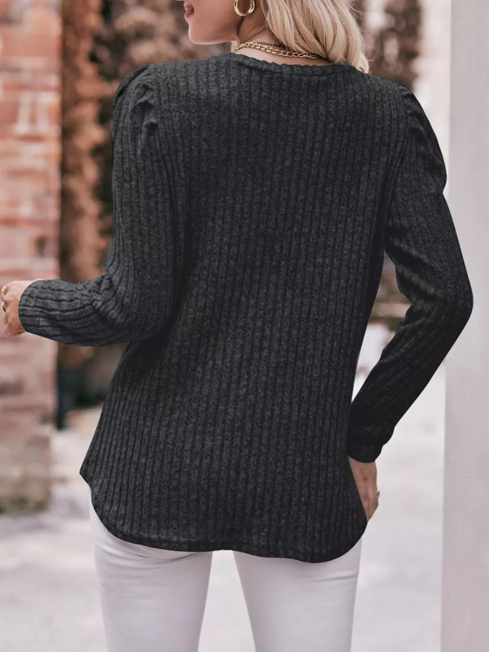 Ribbed Knit Puff Sleeve T-Shirt