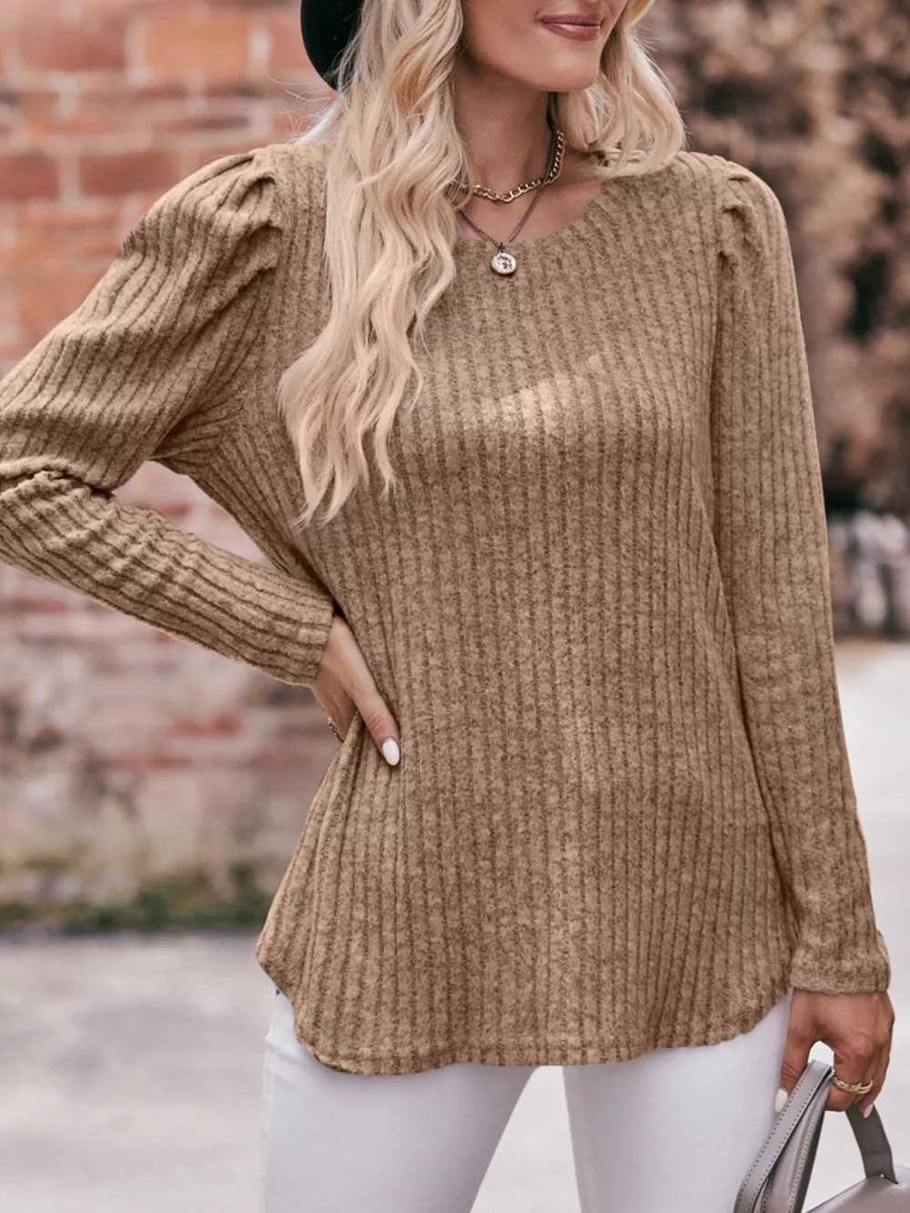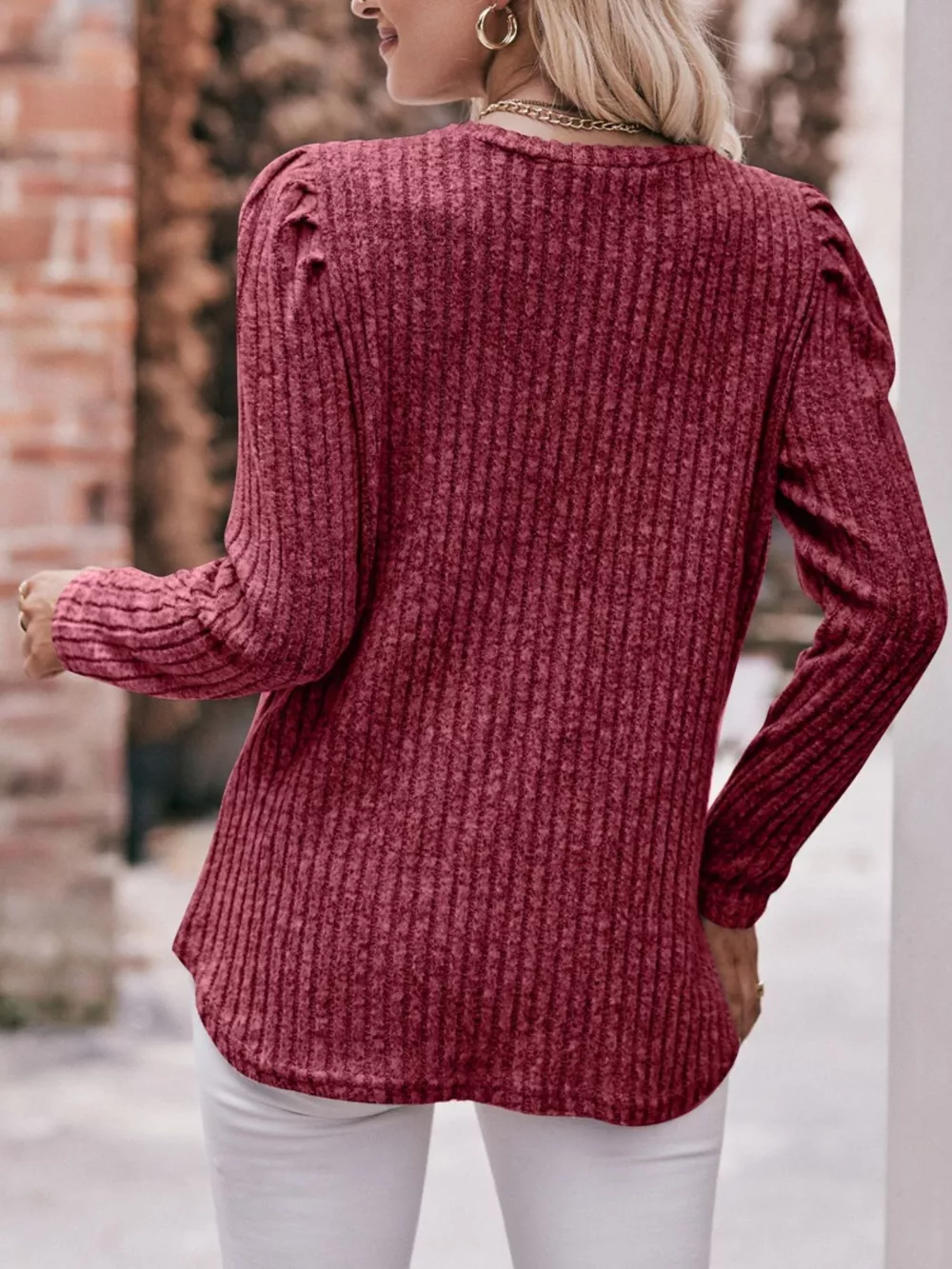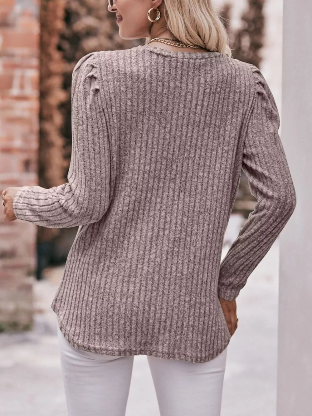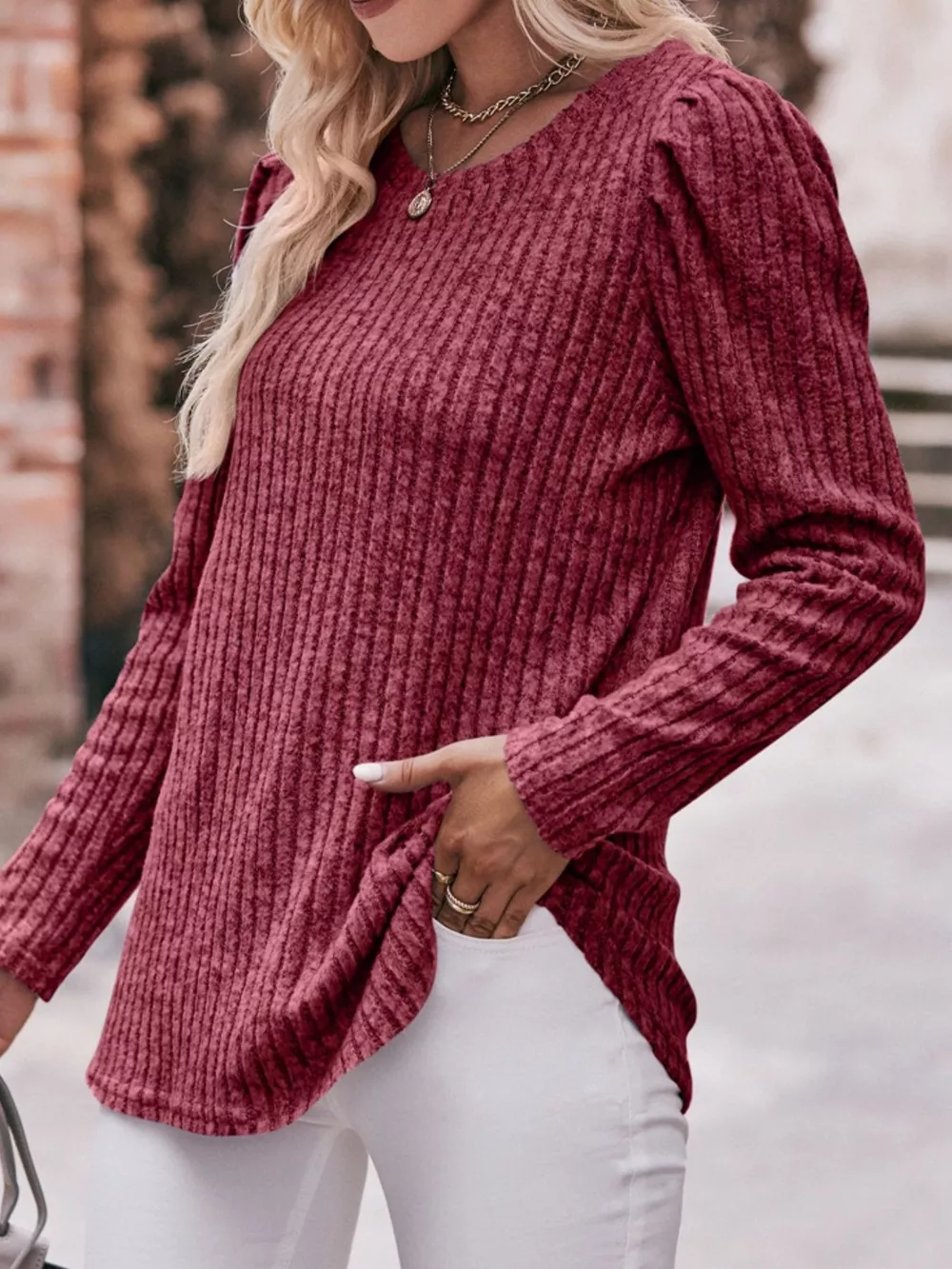 Ribbed Knit Puff Sleeve T-Shirt