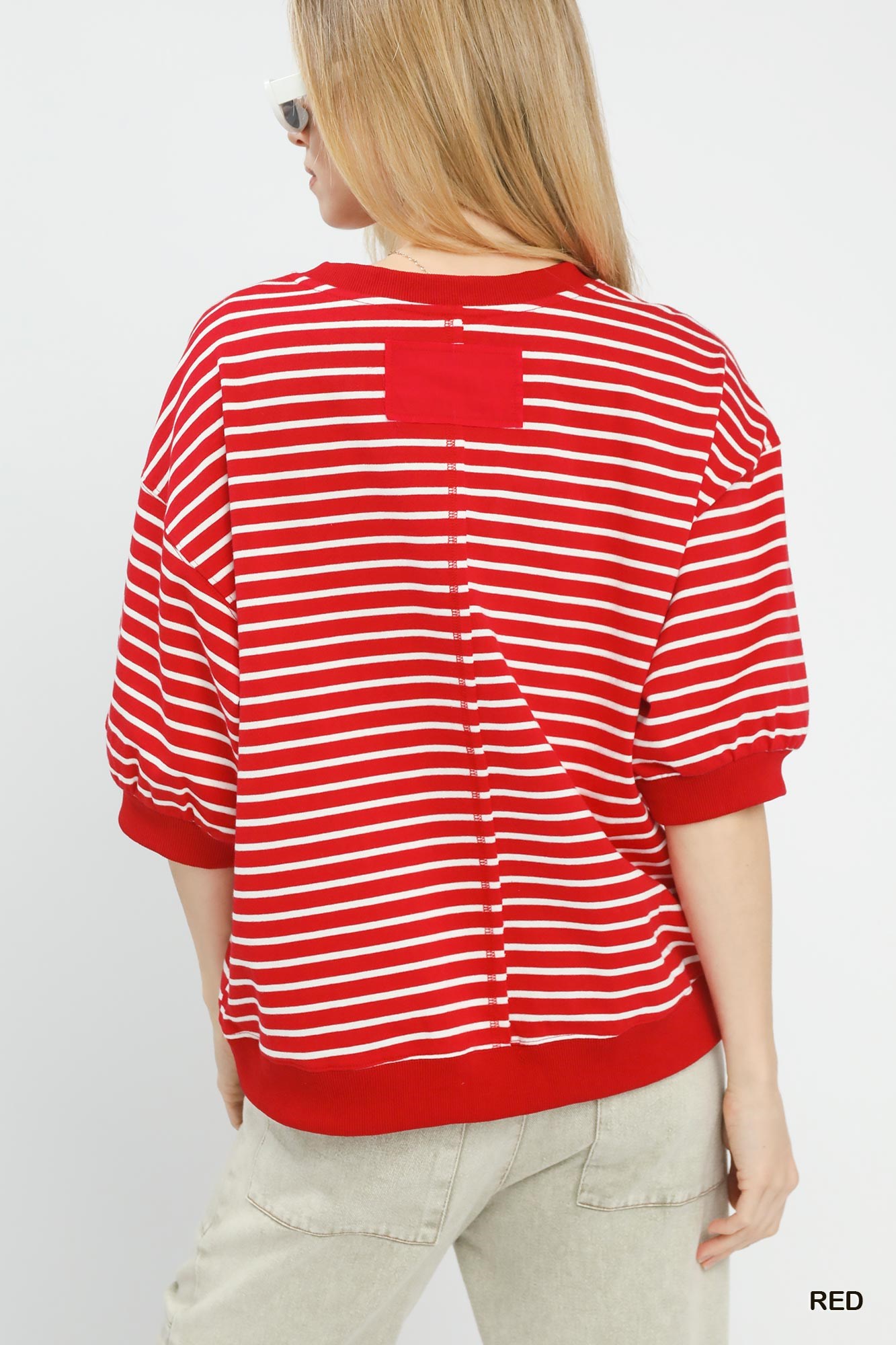A striped short sleeve pullover top is a versatile and easy-to-wear piece for casual occasions. The stripes add a classic touch to the top, creating a timeless and effortless look. The short sleeves make it perfect for warmer weather or for layering with a cardigan or jacket. This top is great for pairing with jeans, shorts, or a skirt for a relaxed and stylish outfit. Overall, a striped short sleeve pullover top is a wardrobe staple that offers comfort and style in one piece.