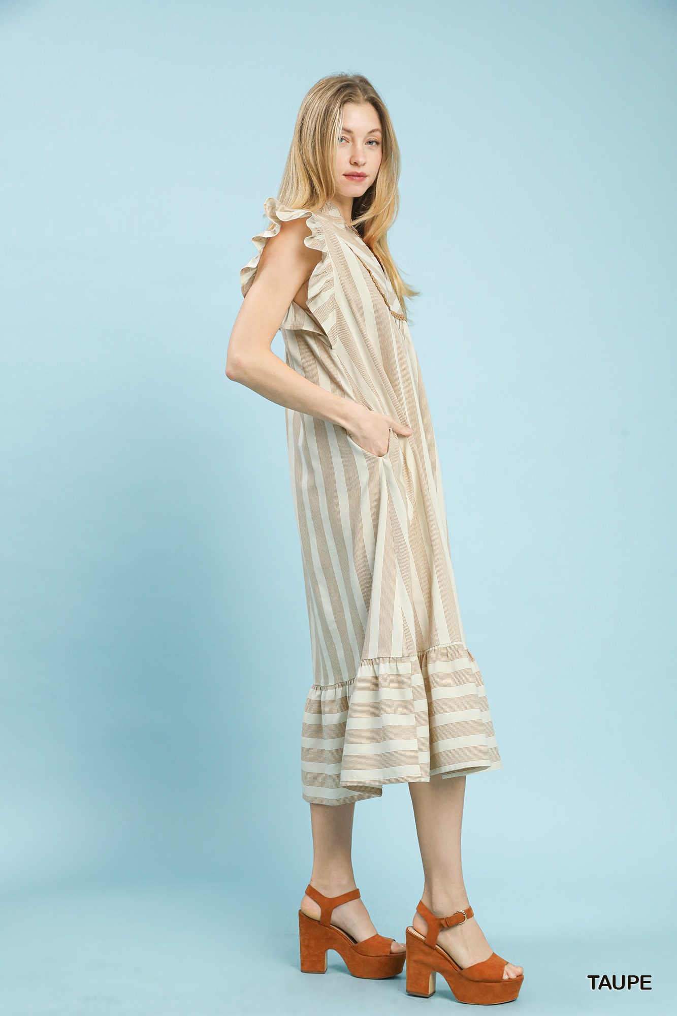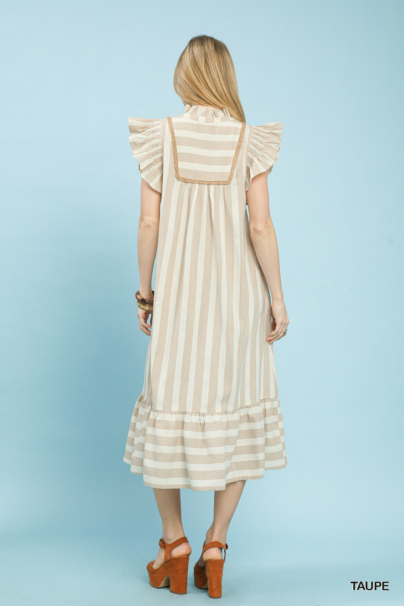A stripe ruffle sleeve tiered midi dress features a charming combination of striped patterns, ruffle sleeves, and tiered layers for a playful and feminine look. The stripes add a classic touch, while the ruffle sleeves and tiered design create movement and visual interest. The midi length falls below the knee, making it a versatile option for various events. This dress is perfect for adding a fun and stylish flair to your wardrobe, whether for a casual day out or a special occasion. Overall, the mix of stripes, ruffle sleeves, and tiered layers in a midi dress creates a chic and on-trend ensemble that is both eye-catching and flattering.