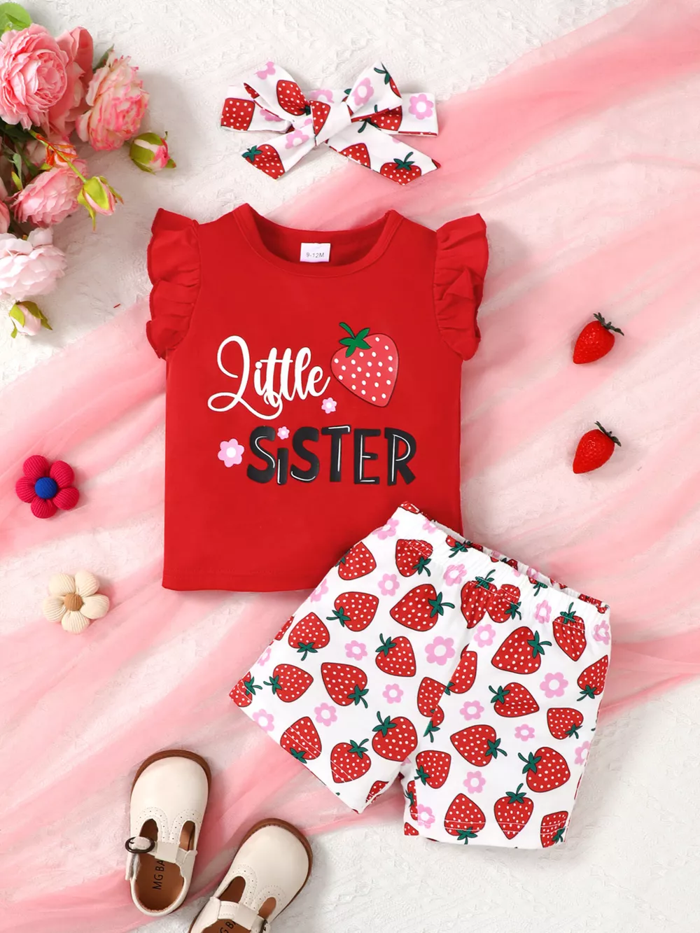 Children's Strawberry Print Ruffle Sleeve Top and Shorts Set