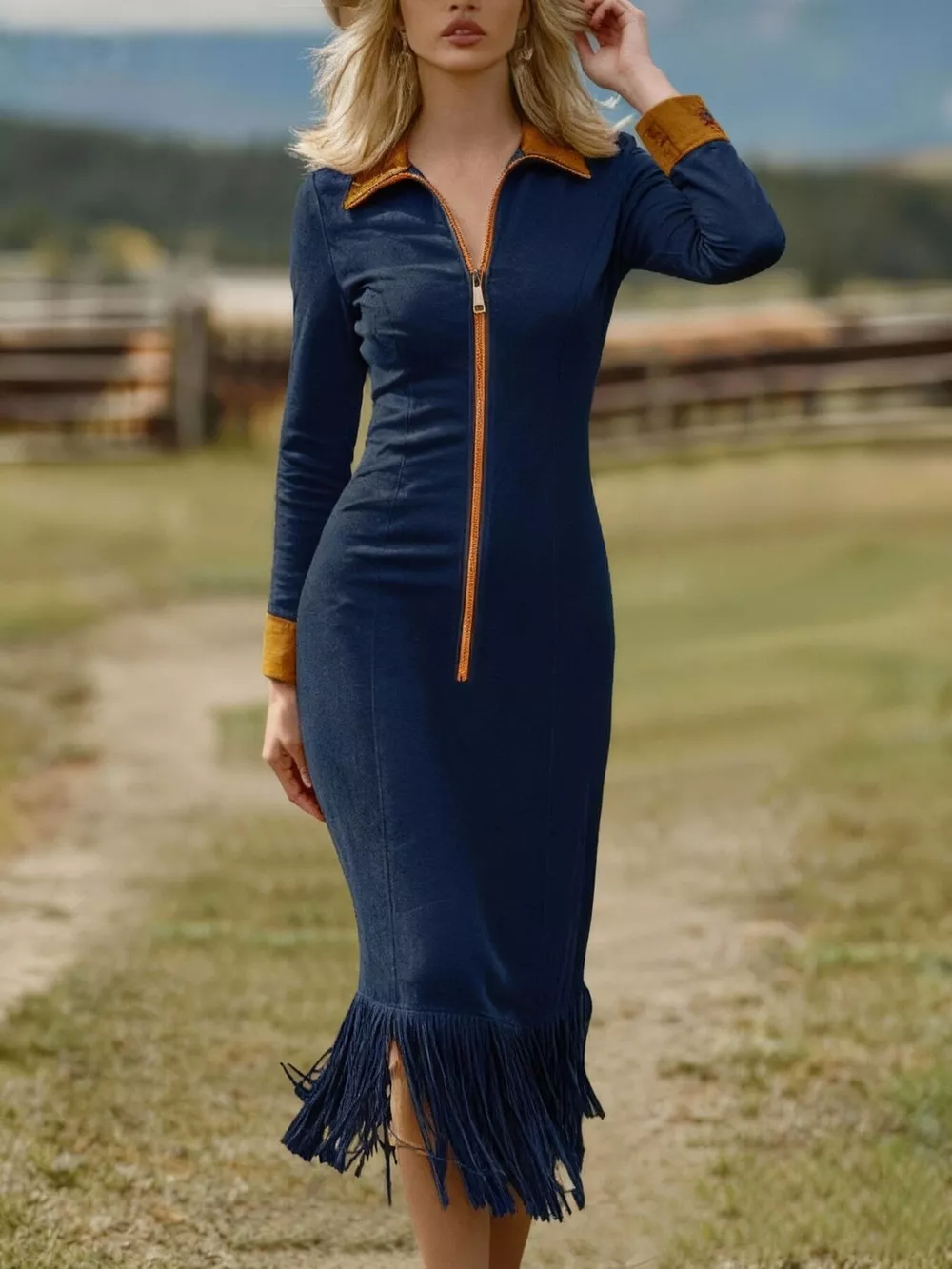 Fringe Hem Zipper Front Bodycon Dress