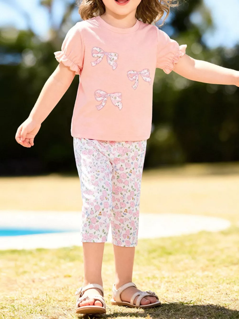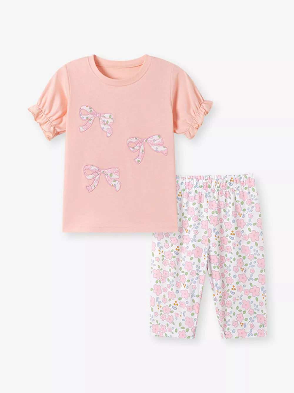 Children's Floral Bowknot Ruffle Sleeve Top & Cropped Pants Set