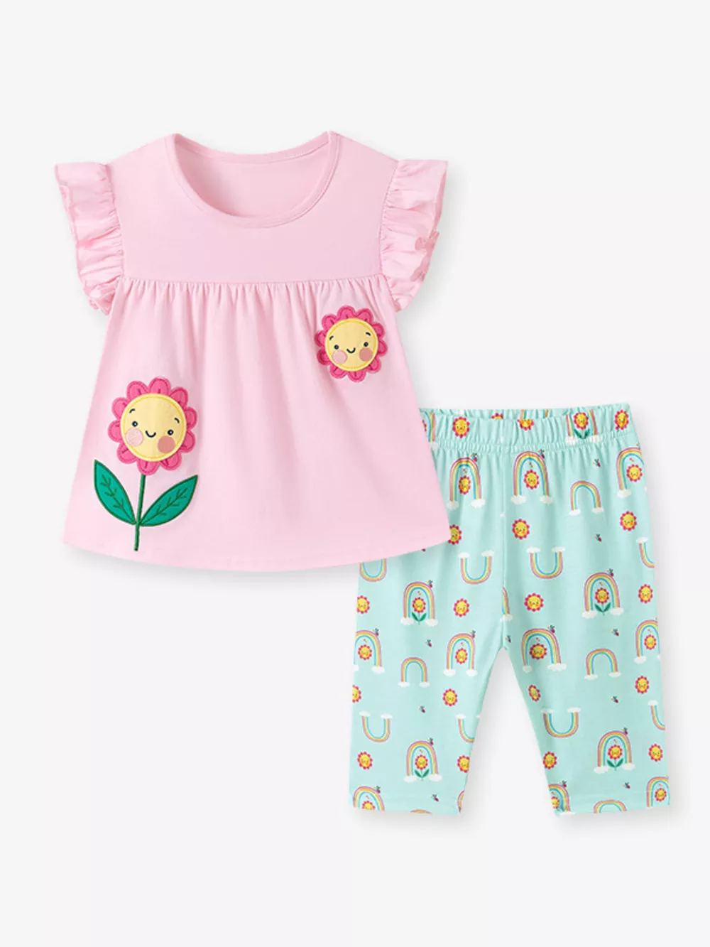 Children's Flower Appliqué Top & Rainbow Print Capri Set
