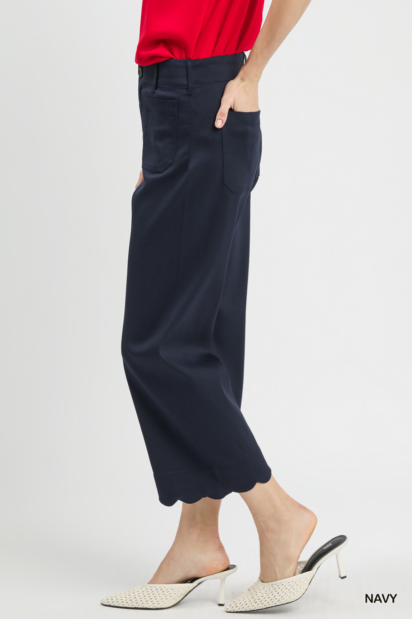 These wide-leg pants feature a flattering silhouette that is on-trend and comfortable to wear. The scalloped hem detail adds a unique and feminine touch to the design. With practical pockets, these pants are both stylish and functional. Please be aware that they are not lined, offering a breezy feel perfect for warmer weather. Elevate your wardrobe with these chic scallop hem wide-leg pants that are sure to make a statement.