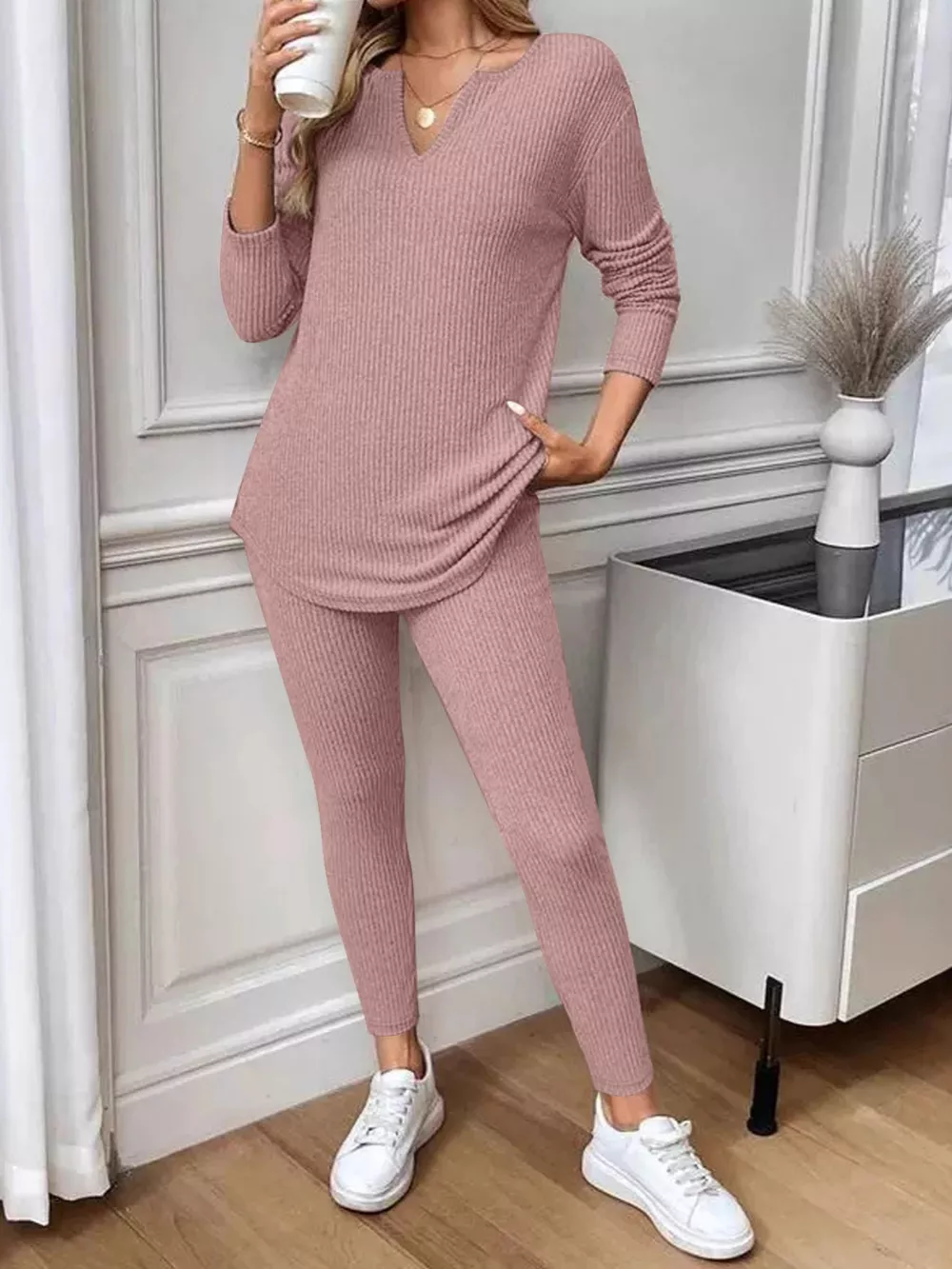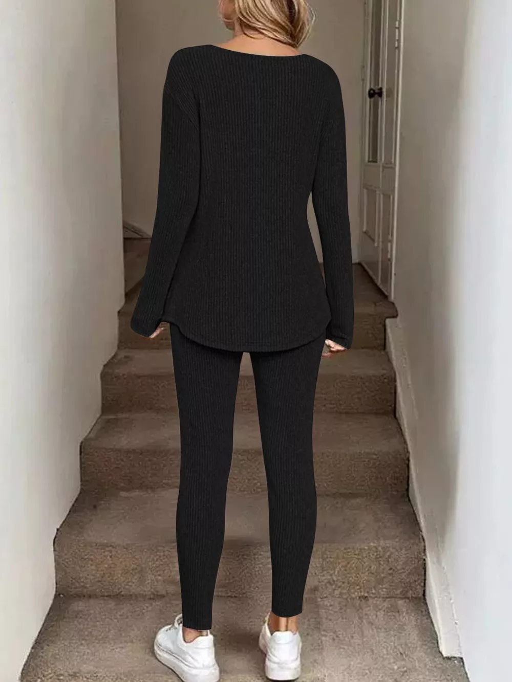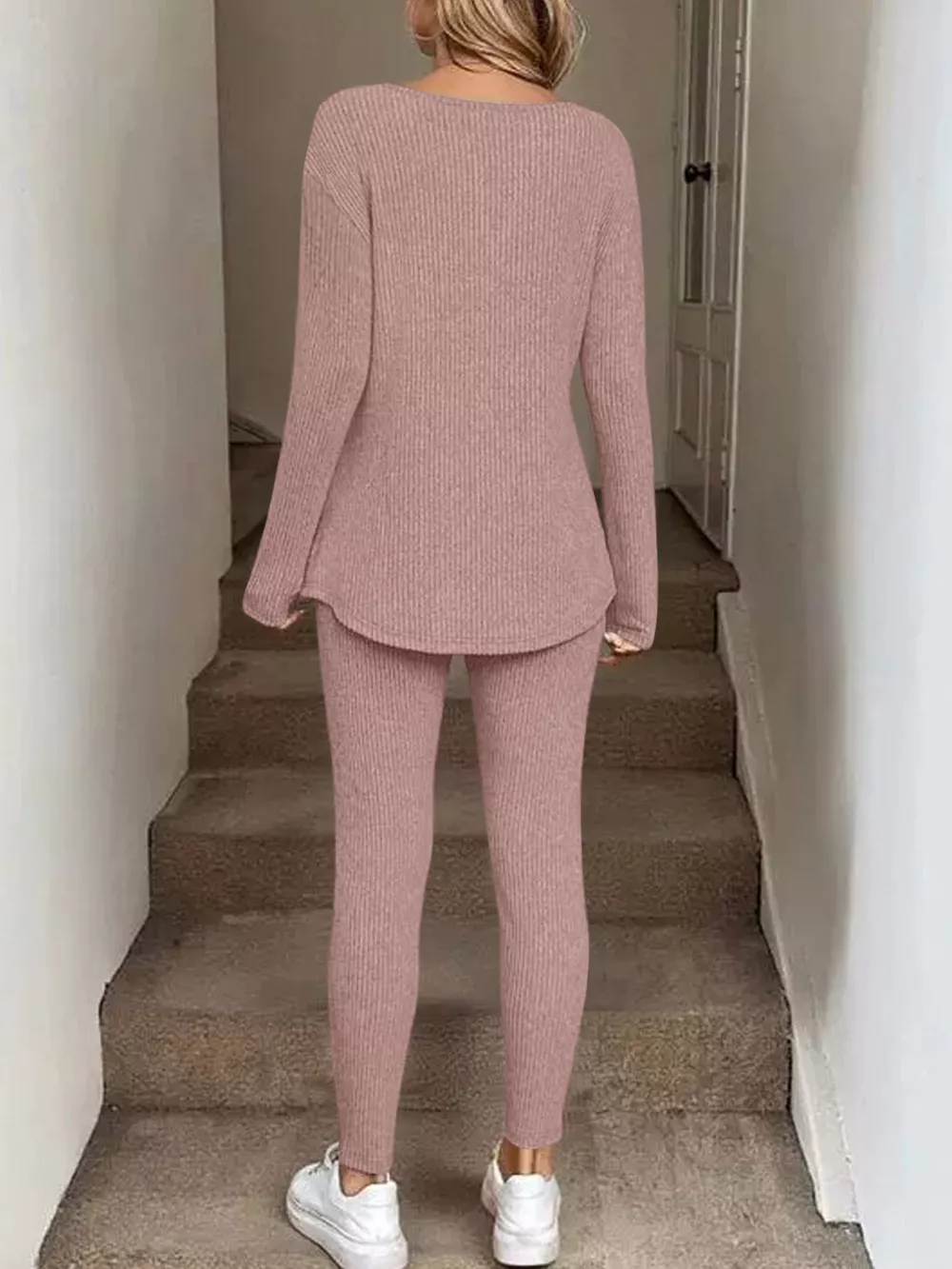 Ribbed Knit Long Sleeve Top and Pants Set
