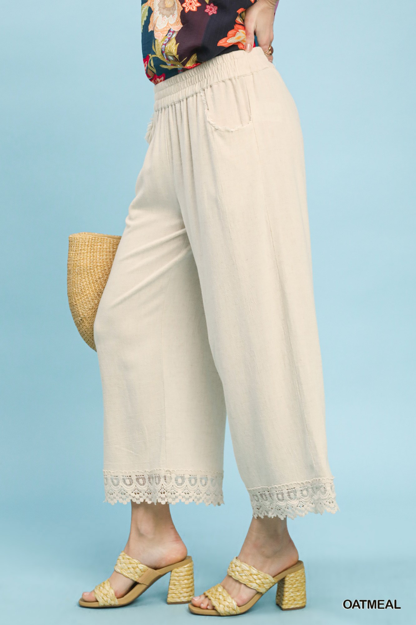 Umgee Linen Wide Leg Cropped Pants with Lace Trim