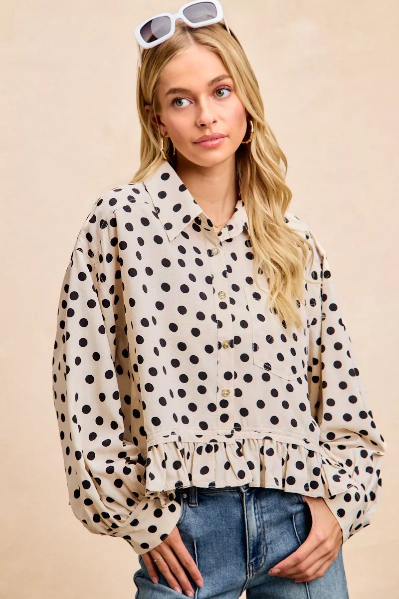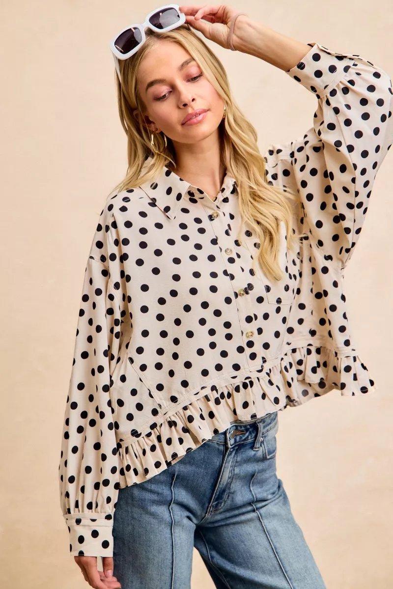 BiBi Crinkle Polka Dot Ruffled Hem Button Up Shirt Top