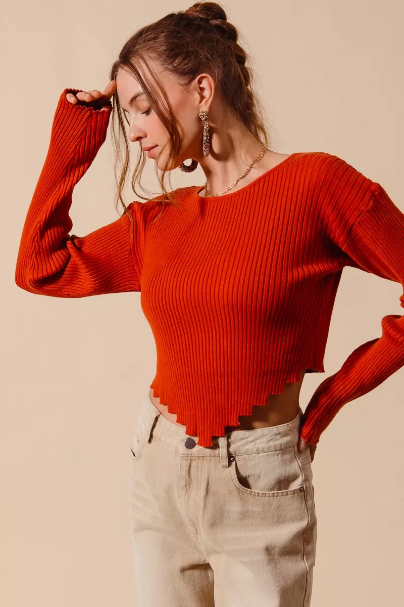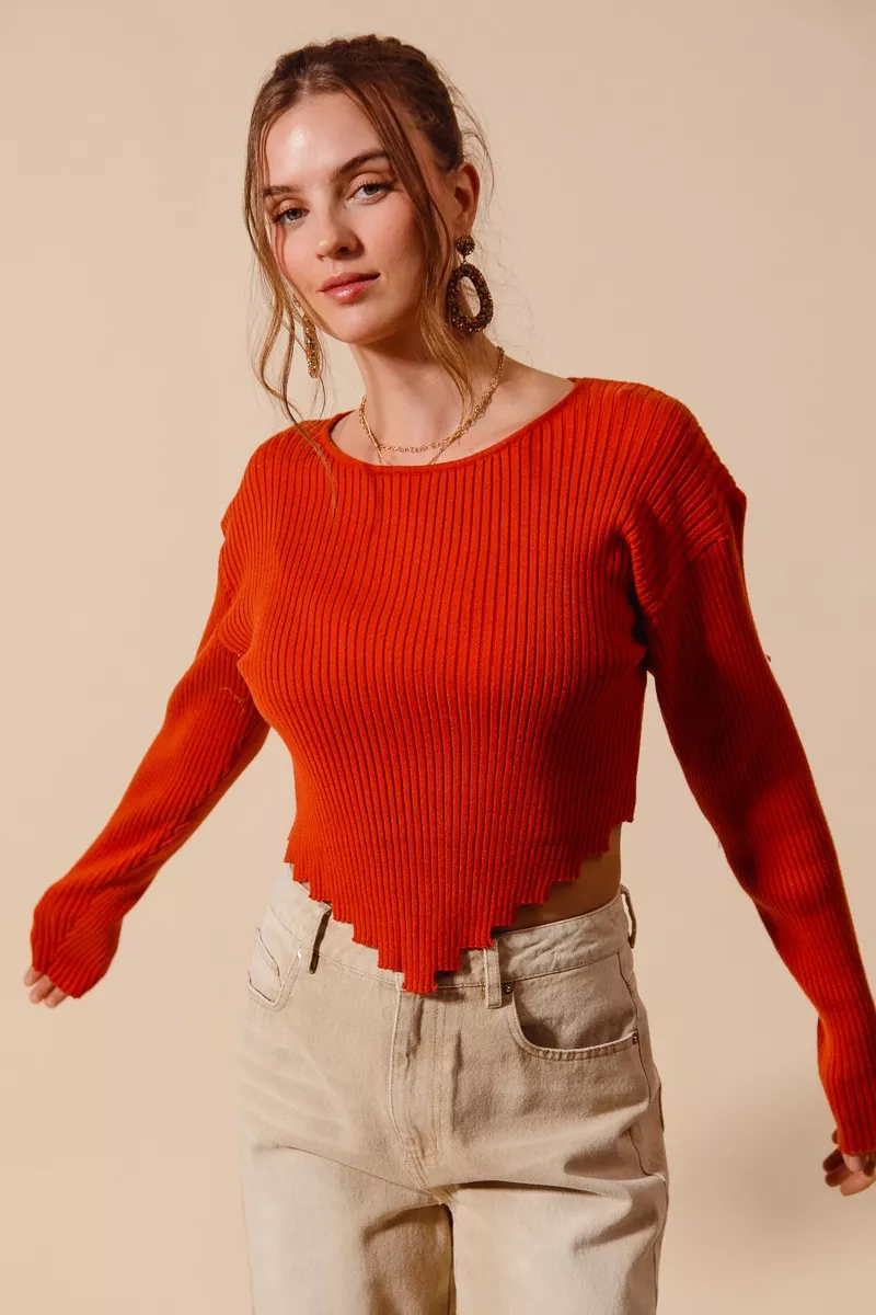 SO ME Rib Knitted Crop Sweater Top With Shaped Hem