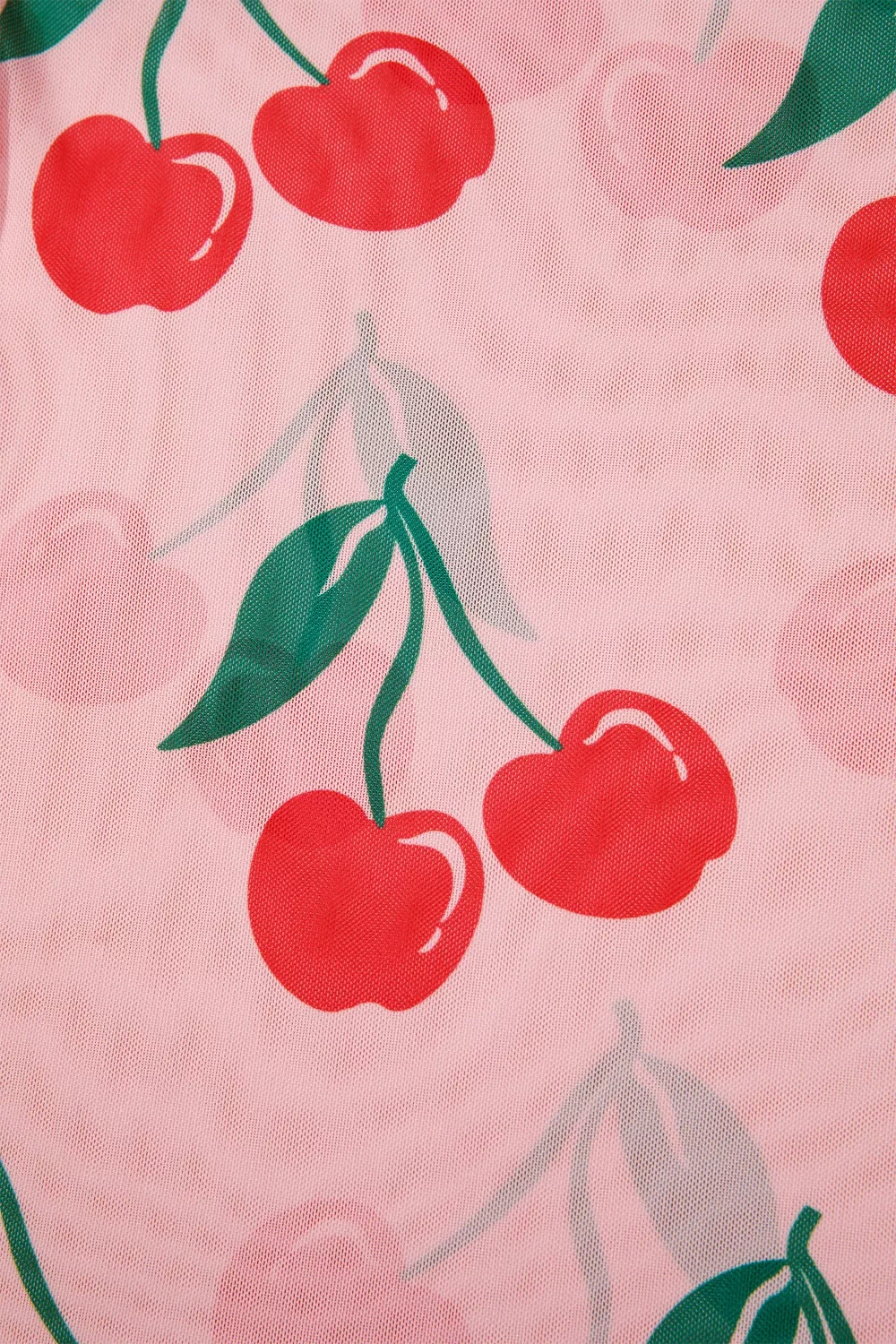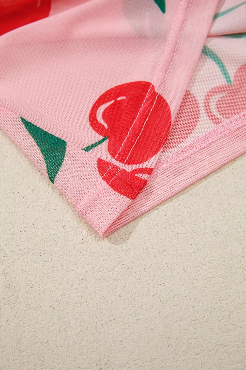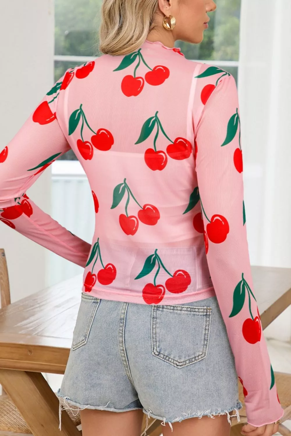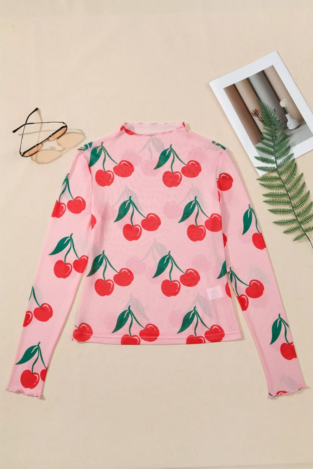 Cherry Print Lettuce Trim Long Sleeve Mesh Top