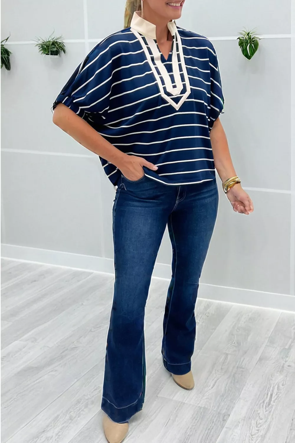 Stripe Stand Collar V Neck Elastic Cuffs Half Sleeve Dolman Top