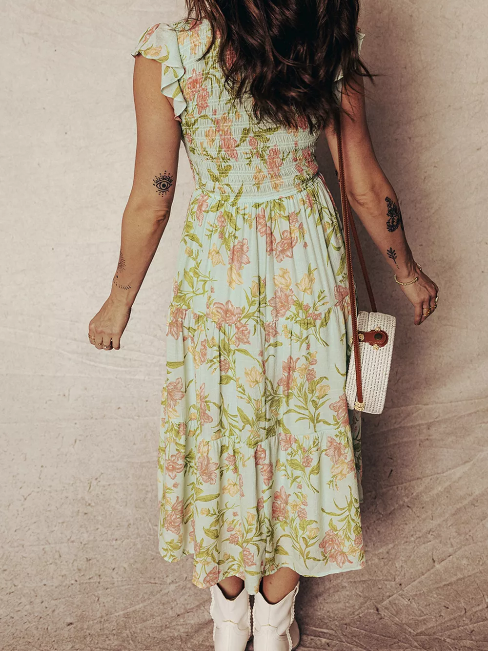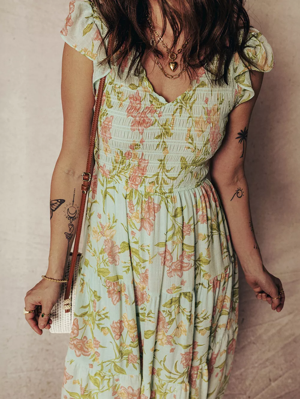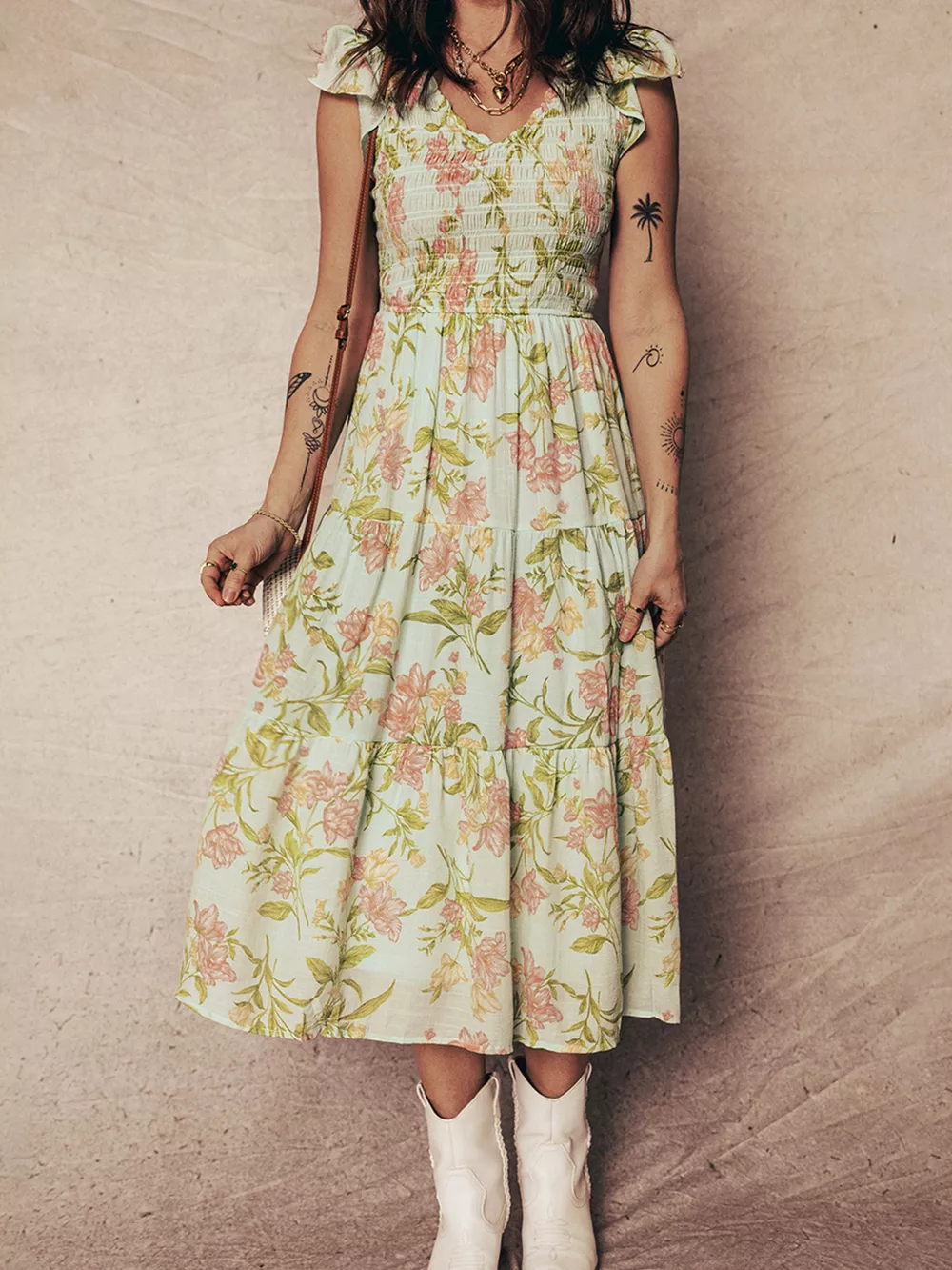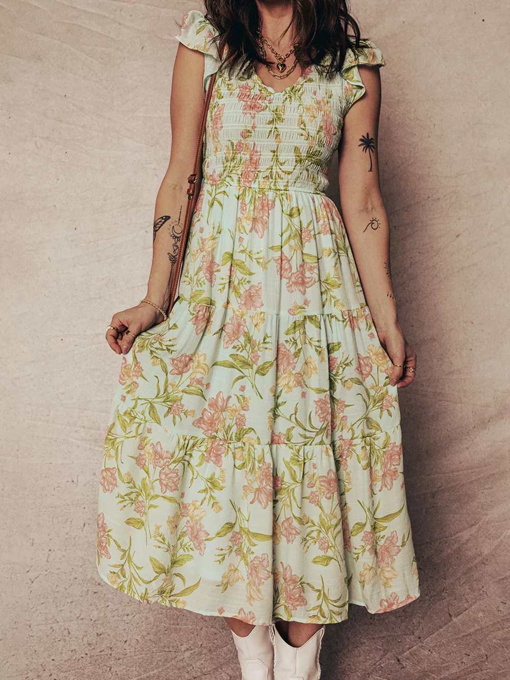 Smocked Bodice Ruffled Sleeveless Tiered Floral Dress