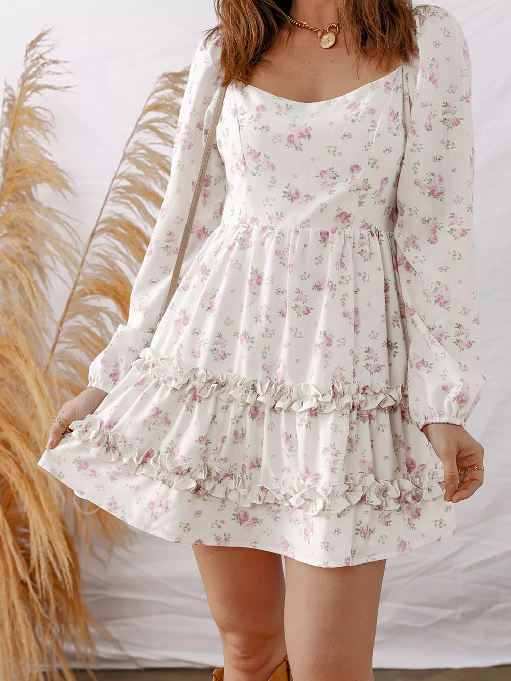 Floral Print Long Sleeve Ruffle Detail Flared Mini Dress