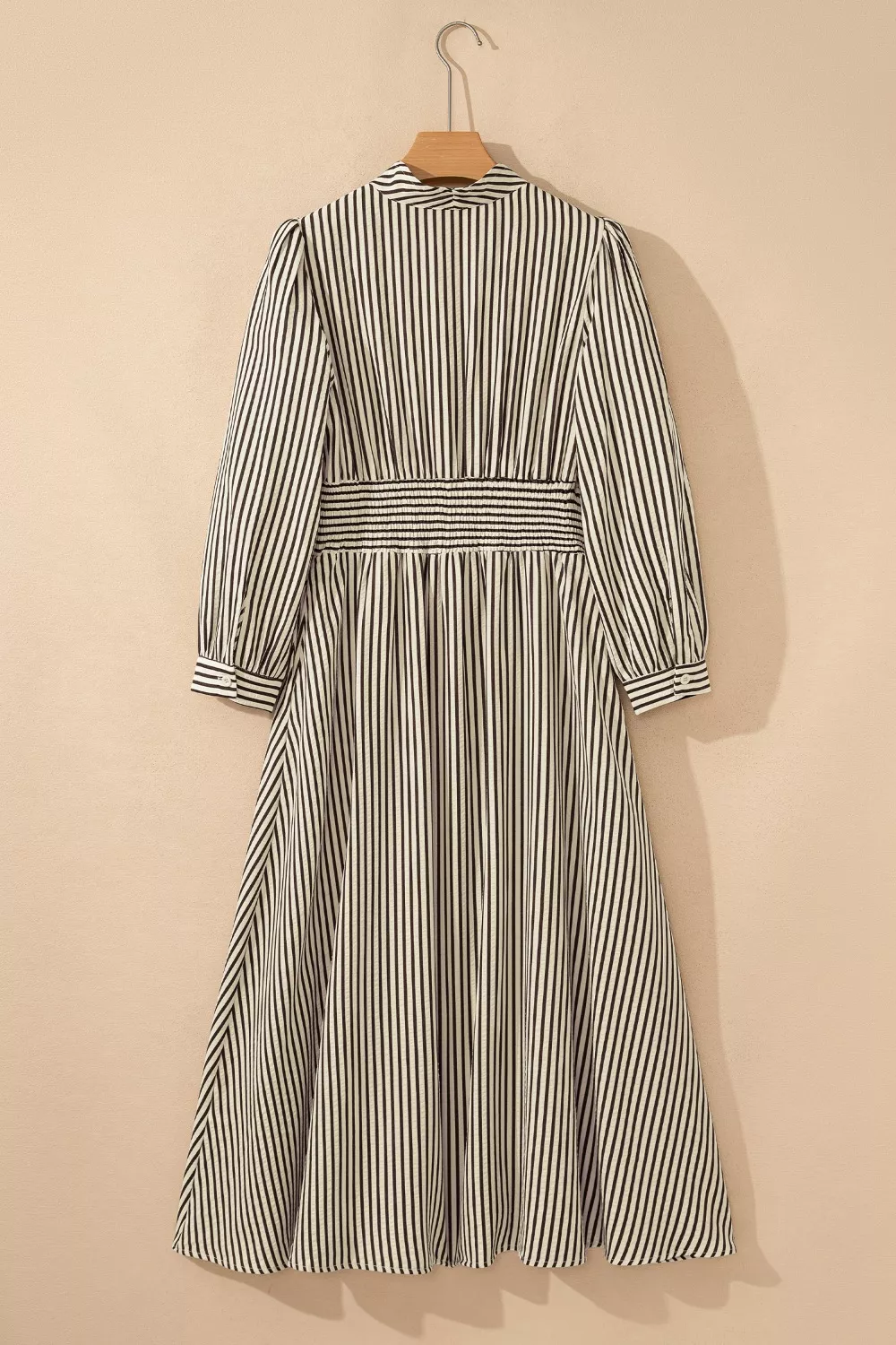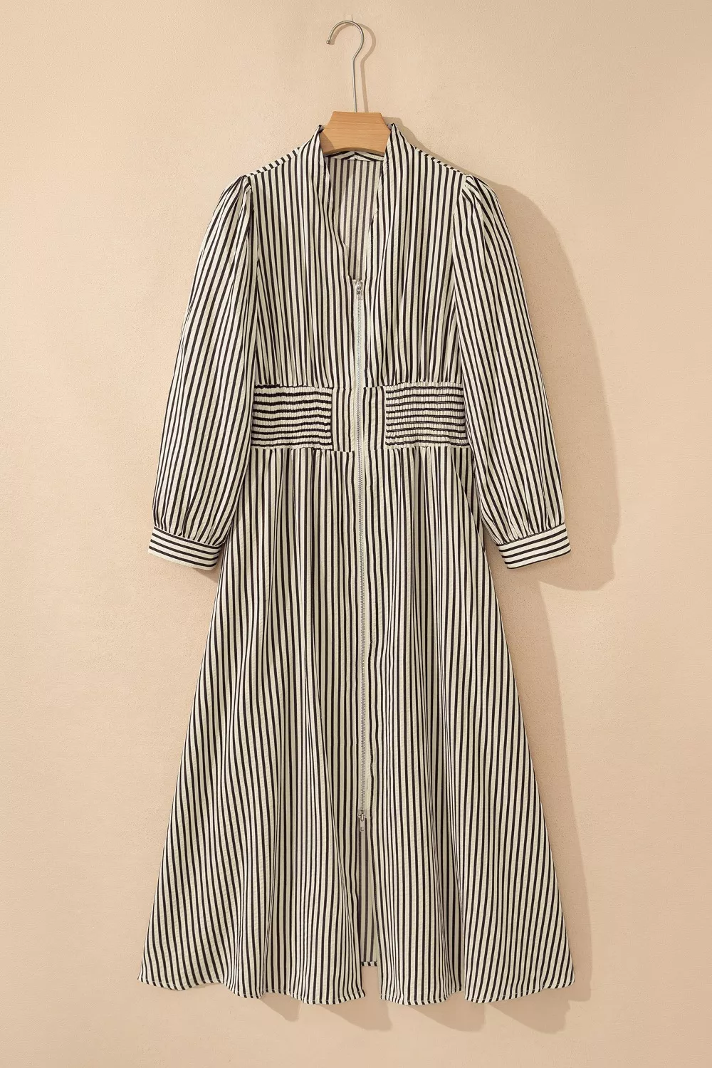 Stripe V Neck Zip Front Cinched High Waist Midi Dress