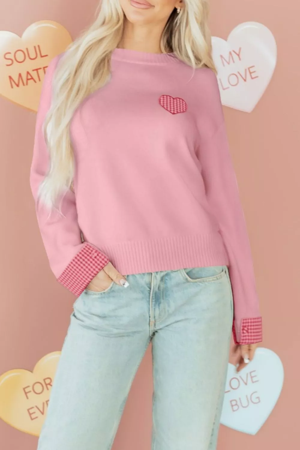 Plaid Heart Embroidered Cuffed Drop Shoulder Crew Neck Sweater