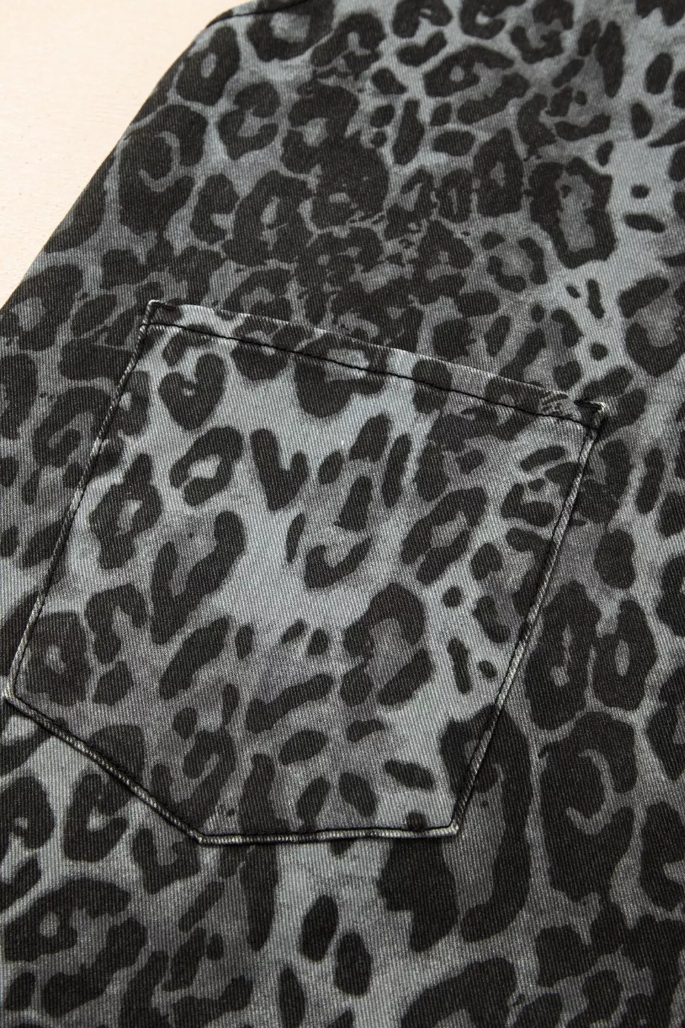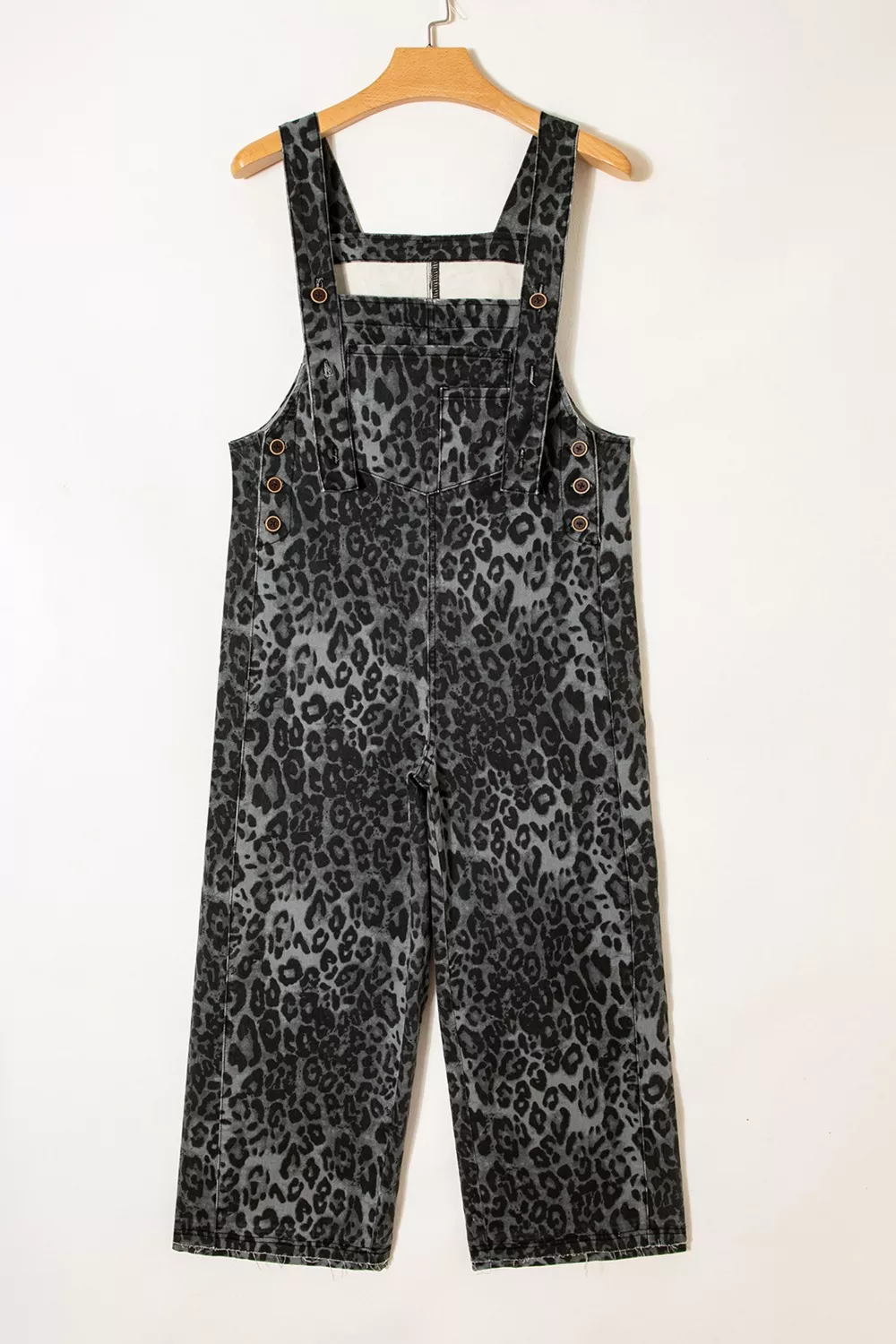 Leopard Print Button Adjustable Straps Cropped Loose Denim Overalls