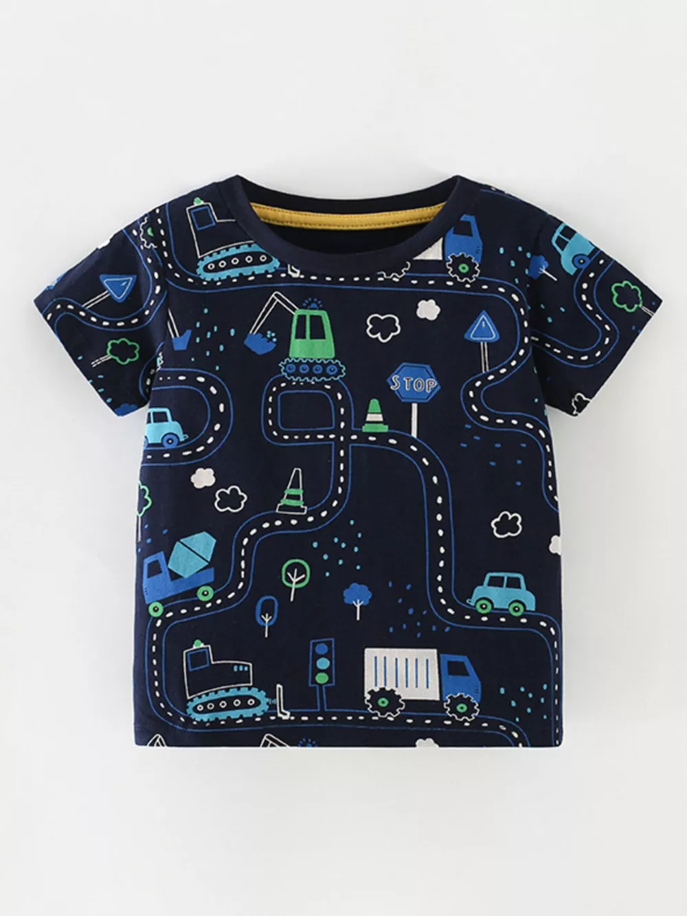 Children's Construction Vehicle Print Short Sleeve T-Shirt