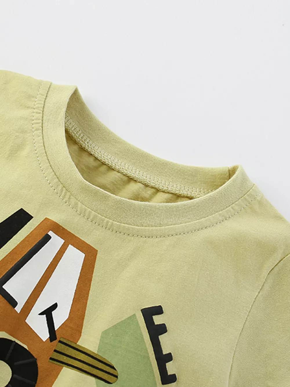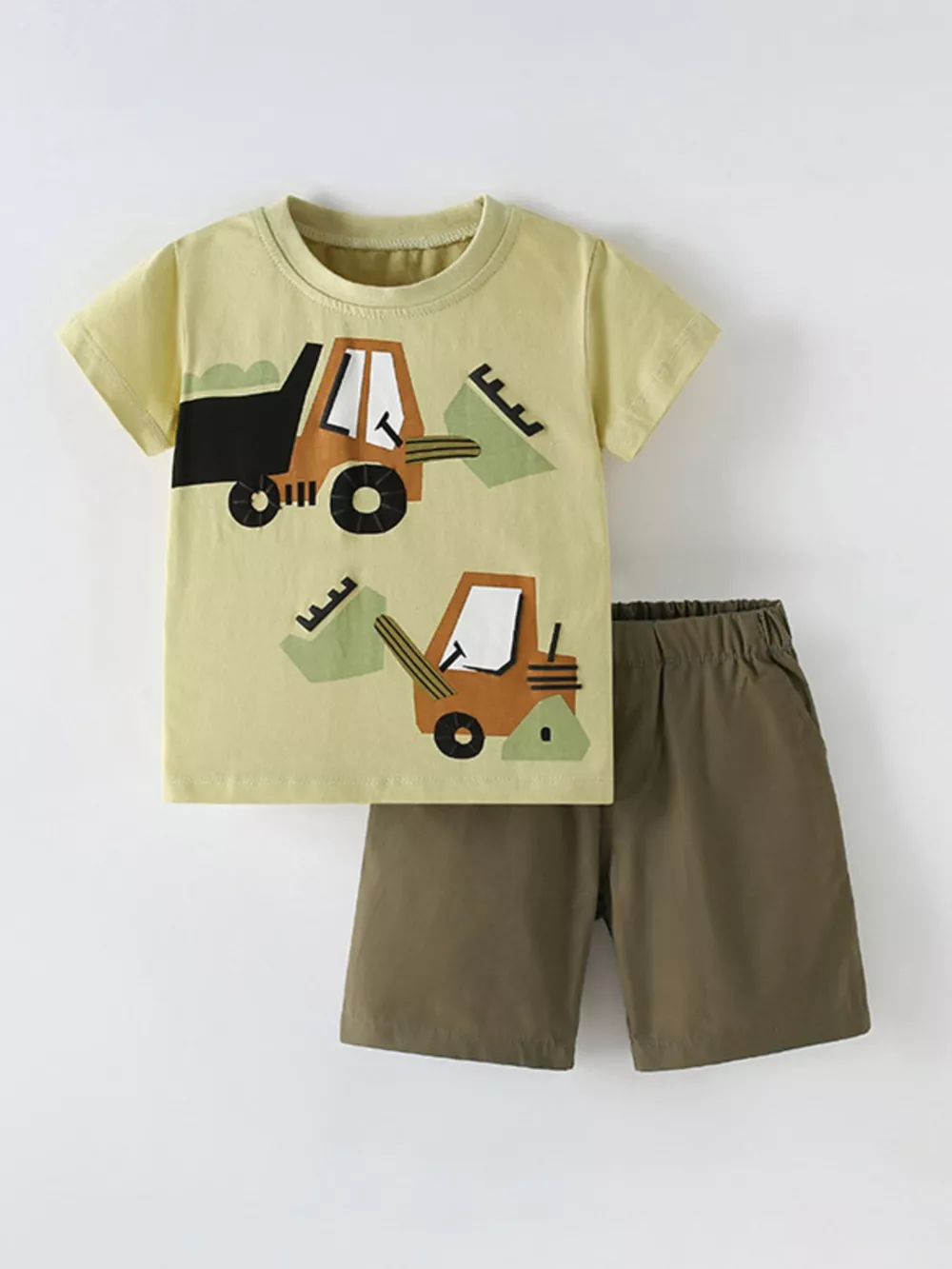 Children's Cartoon Excavator Round Neck Tee and Shorts Set