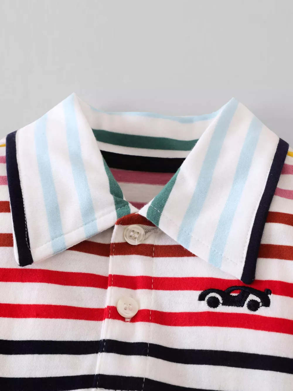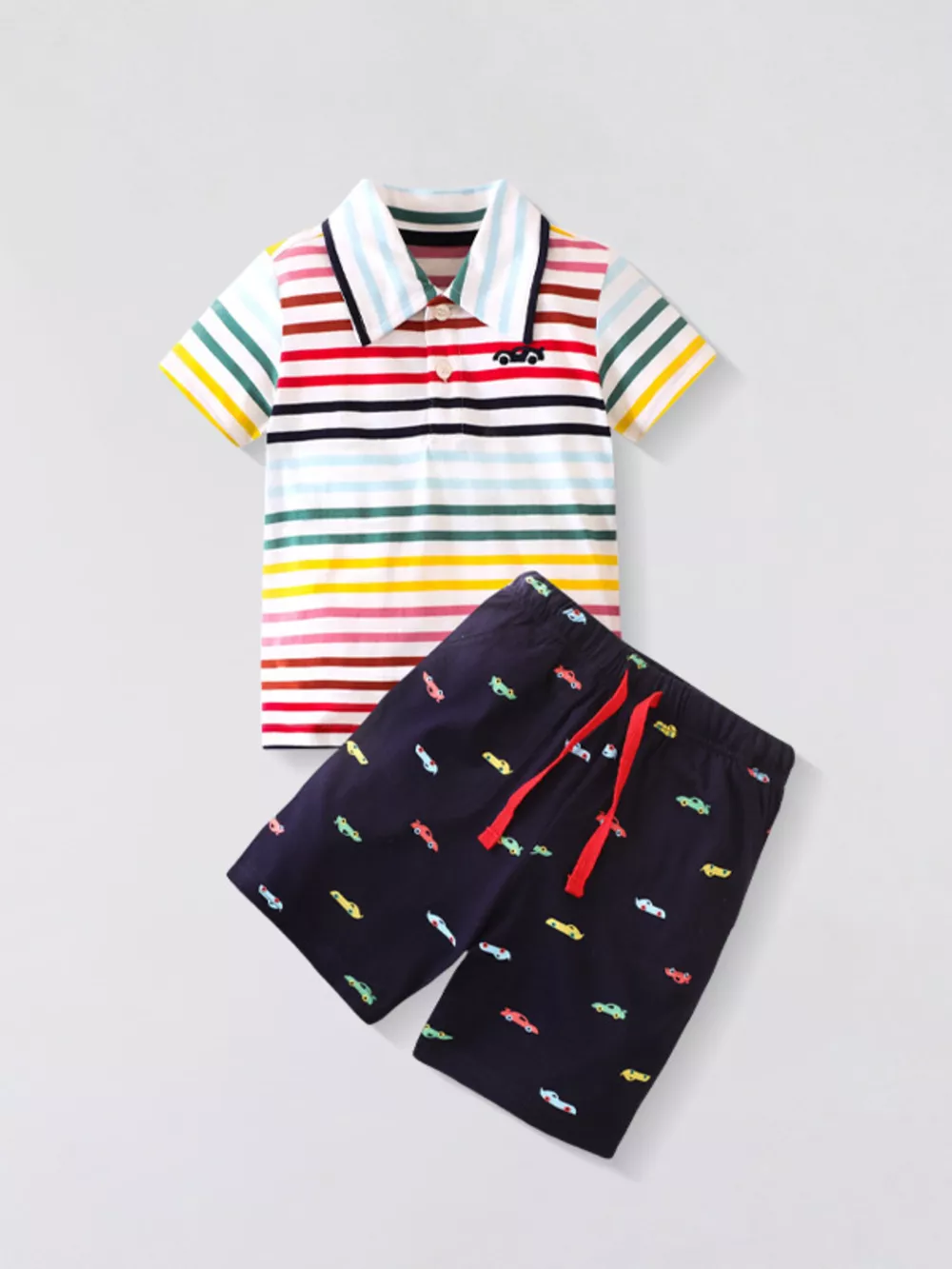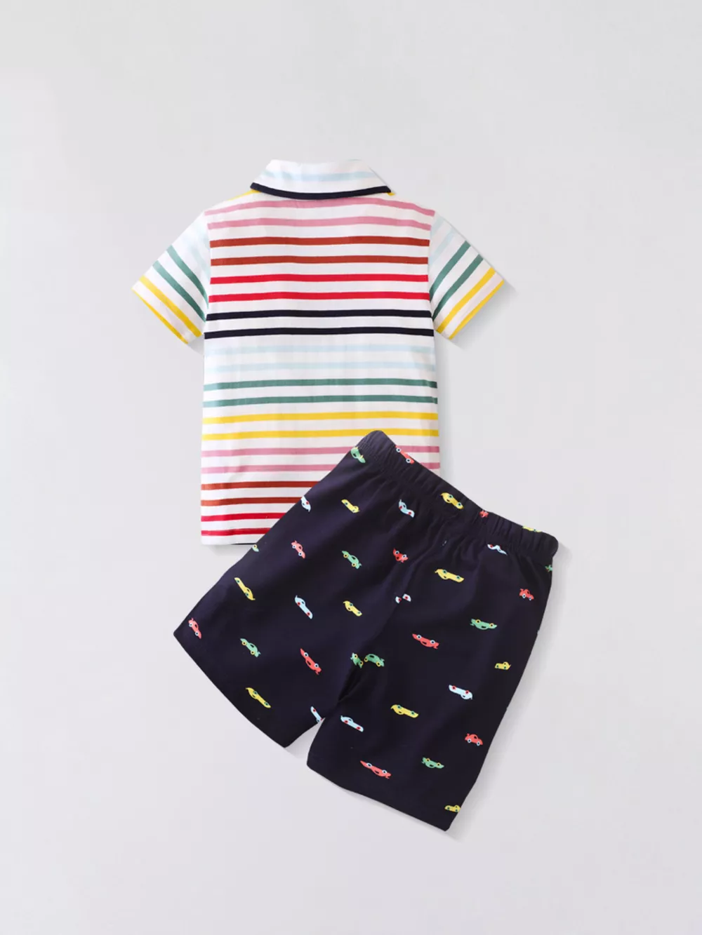 Children's Colorful Striped Polo Shirt and Car Print Shorts Set