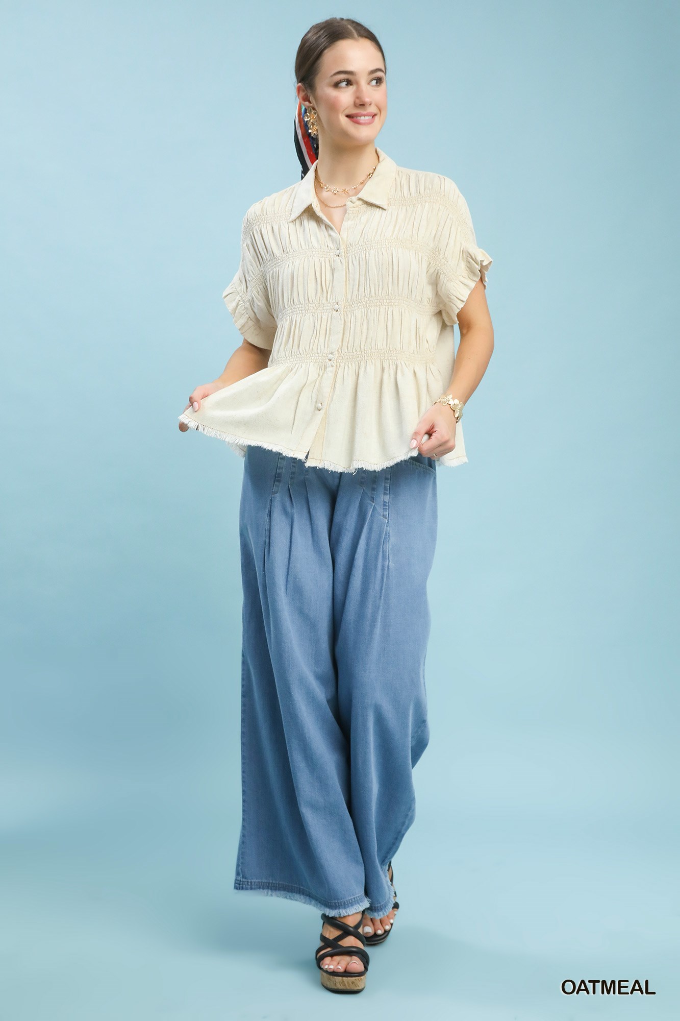 Umgee Washed Linen Blend Smocked Shirt