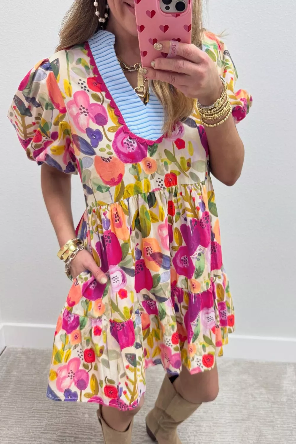 Floral Print Ricrac Trim Striped Patchwork V Neck Dress