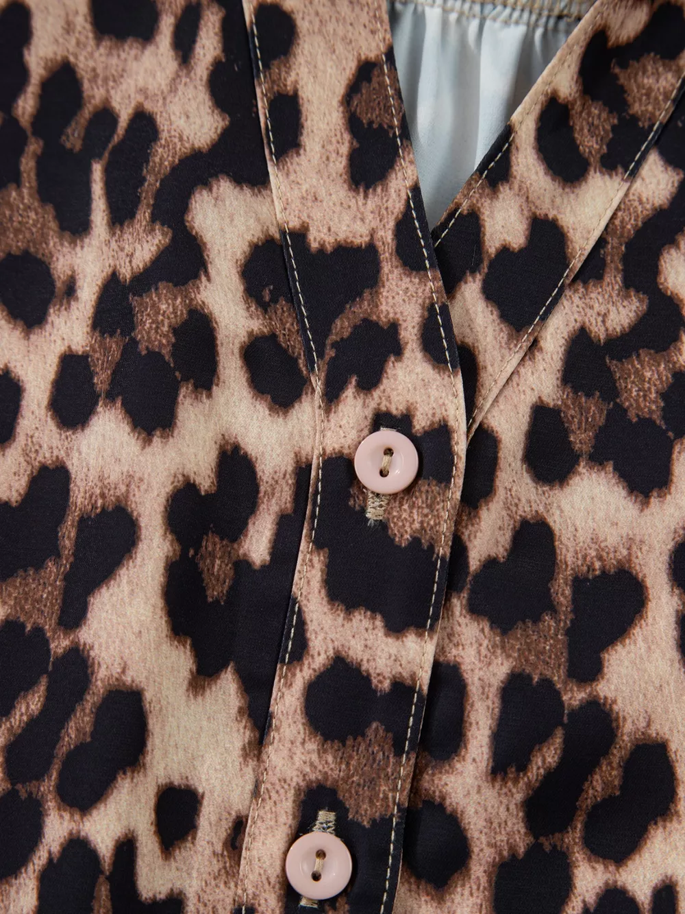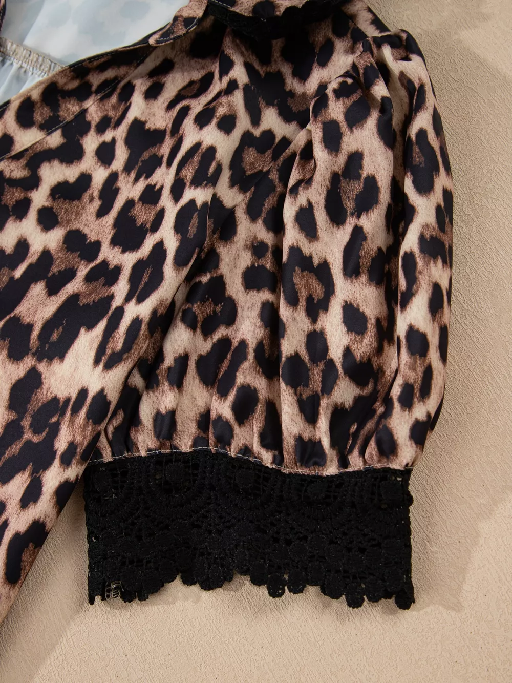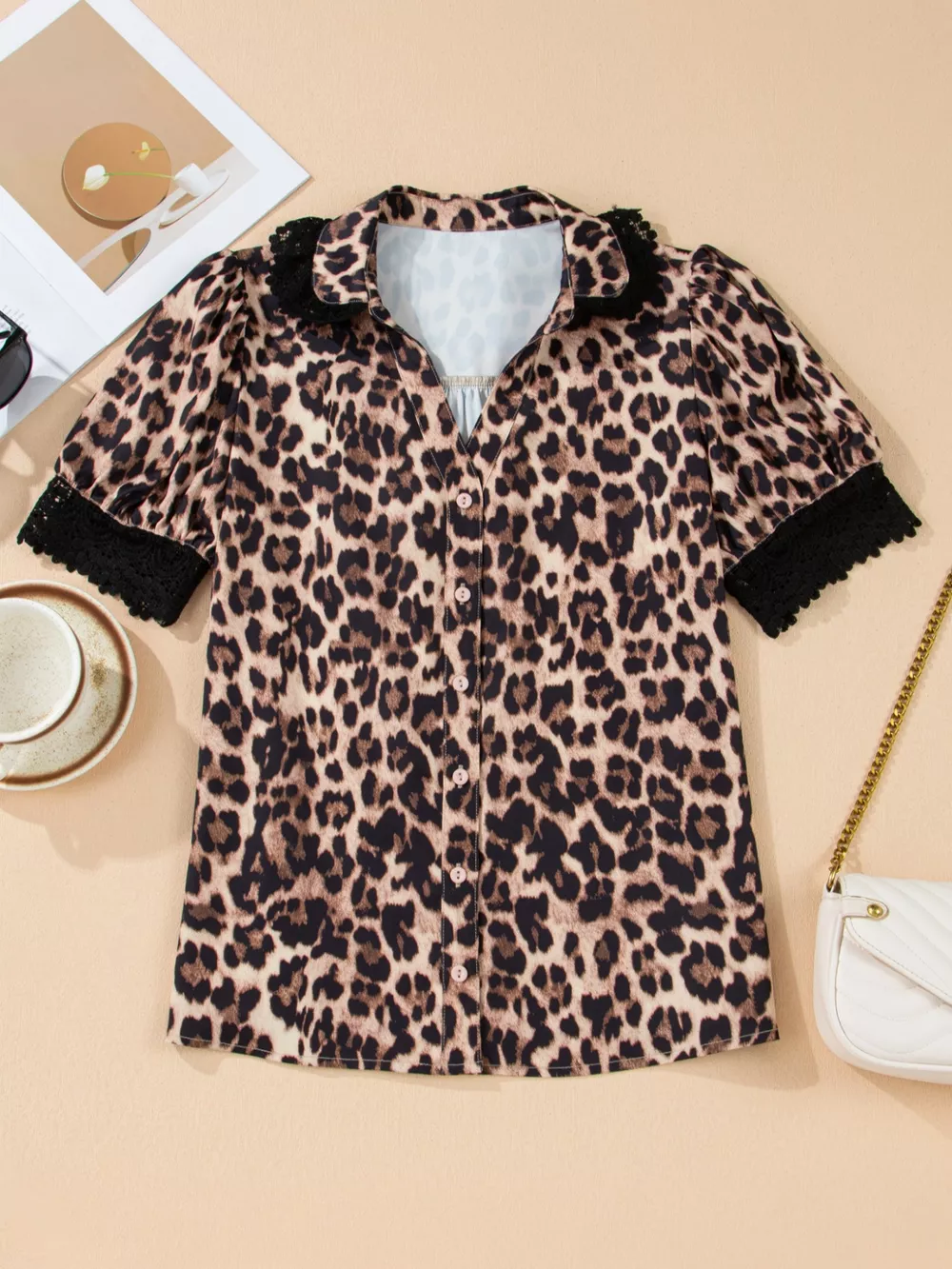 Leopard Print Button Down Lace Trim Short Sleeve Shirt