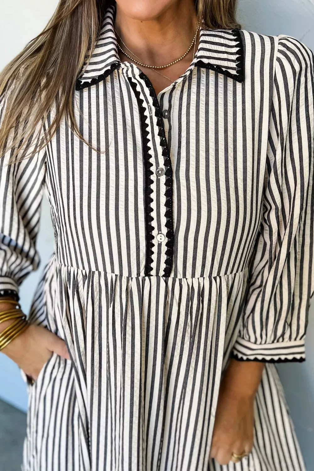 Stripe Scallop Trim Shirt Collar Half Button 3/4 Sleeve Dress