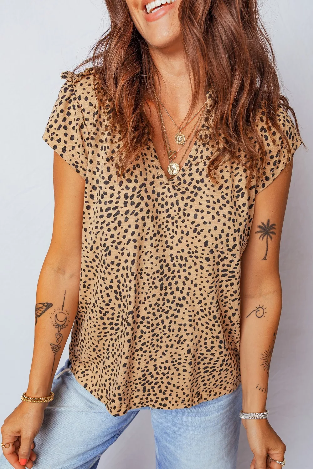 Cheeath Print Frilled V Neck Shirred Detail Short Sleeve Blouse