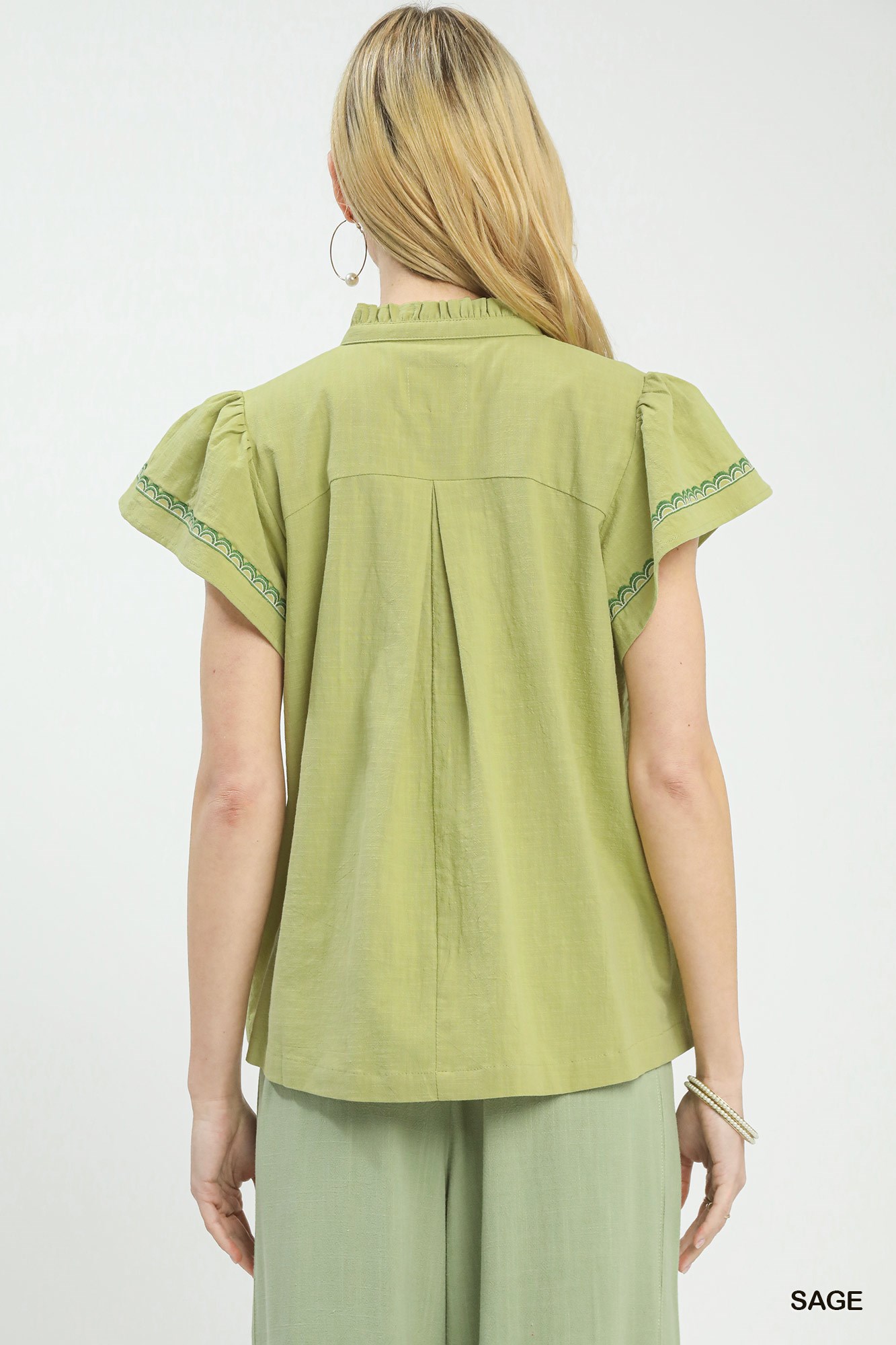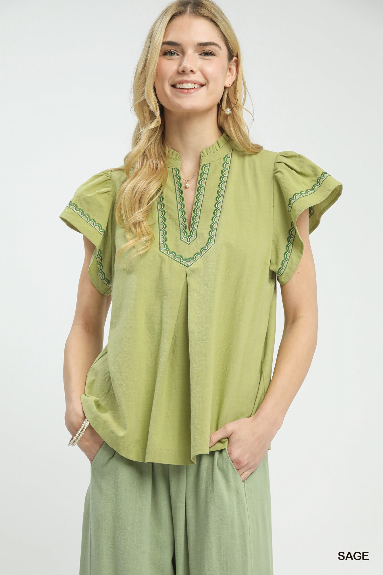 Upgrade your look with the chic Embroidered Flutter Sleeve Blouse. The split V-neck with embroidered trim adds a stylish detail to this top. Featuring flutter sleeves for a touch of femininity, this blouse offers a flowy silhouette that is perfect for both casual and dressy occasions. Please note that this blouse is not lined, ensuring a lightweight and comfortable fit. Embrace effortless style with this versatile and fashionable piece.