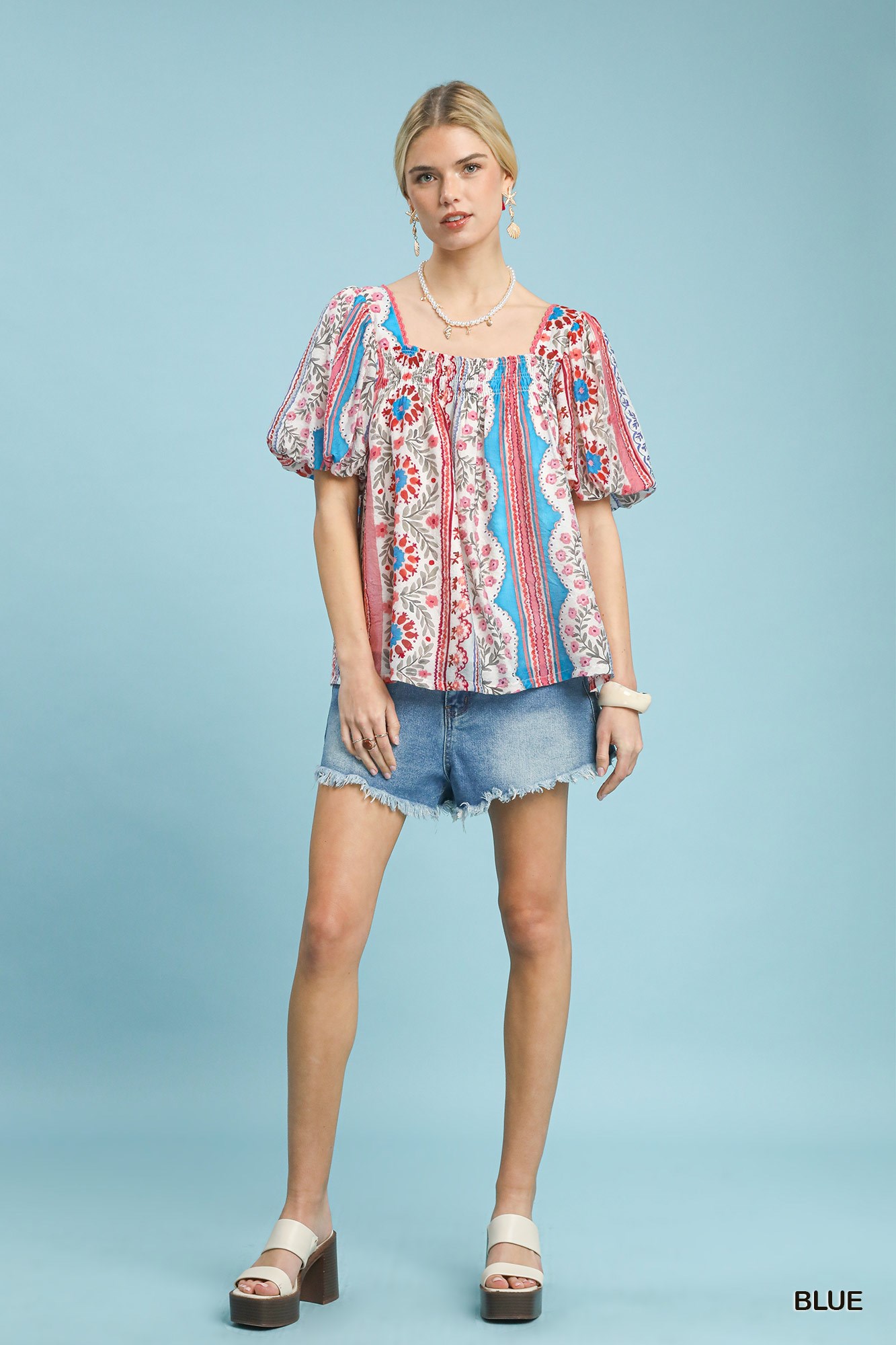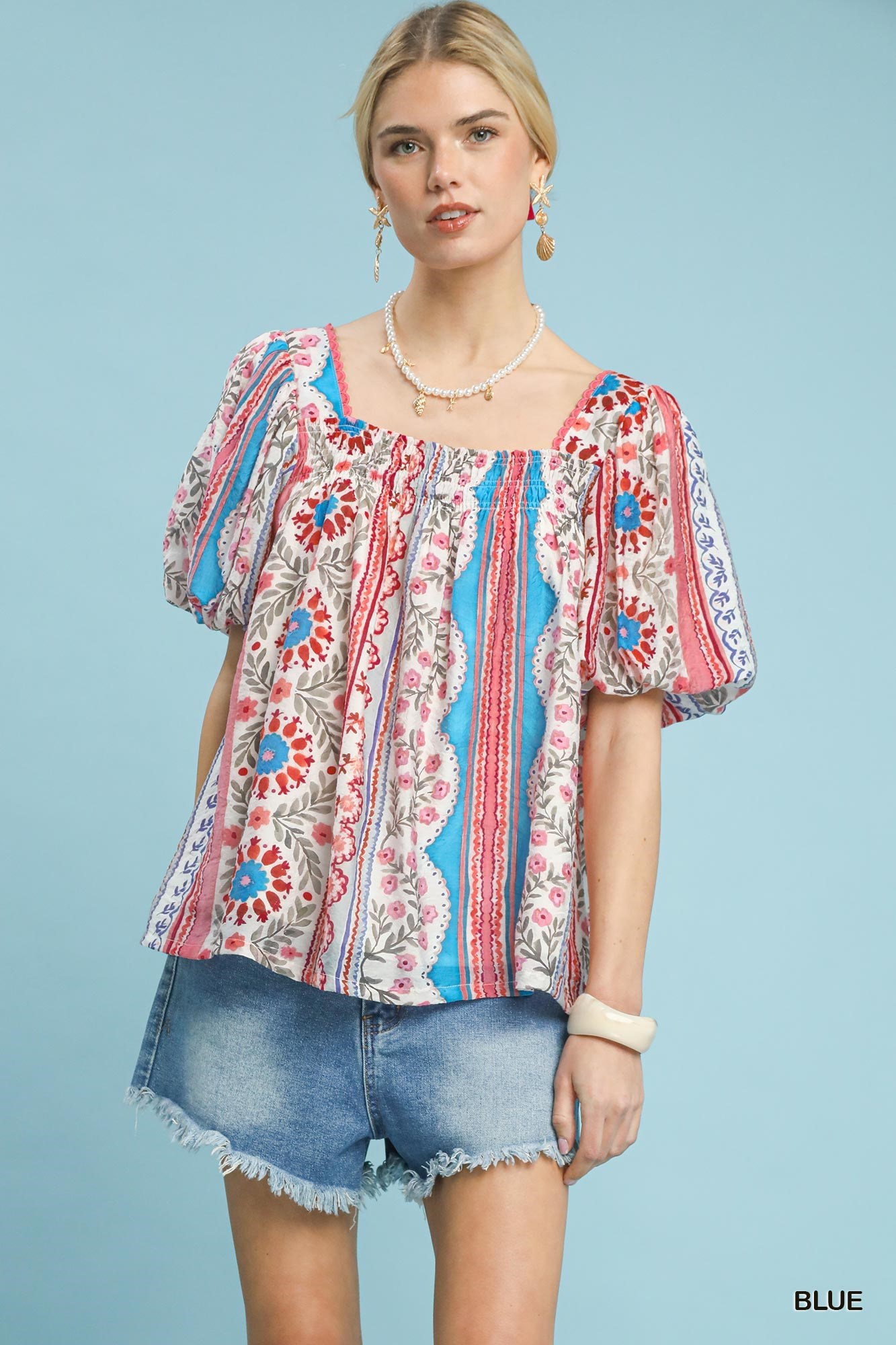 Umgee Patchwork Puff Sleeve Smocked Blouse