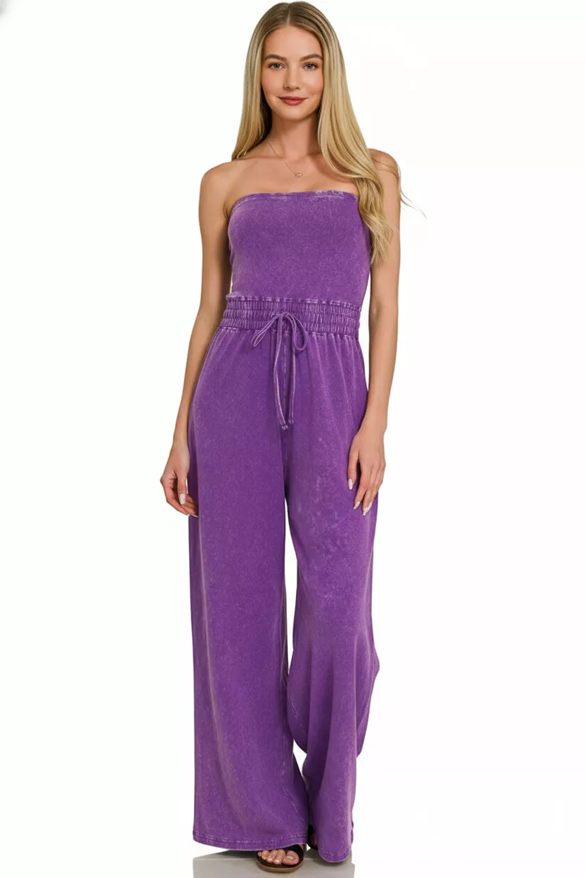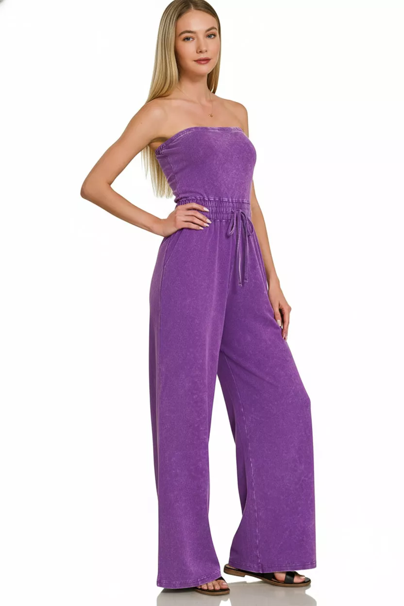 Zenana Acid Washed Strapless Tube Top Jumpsuit